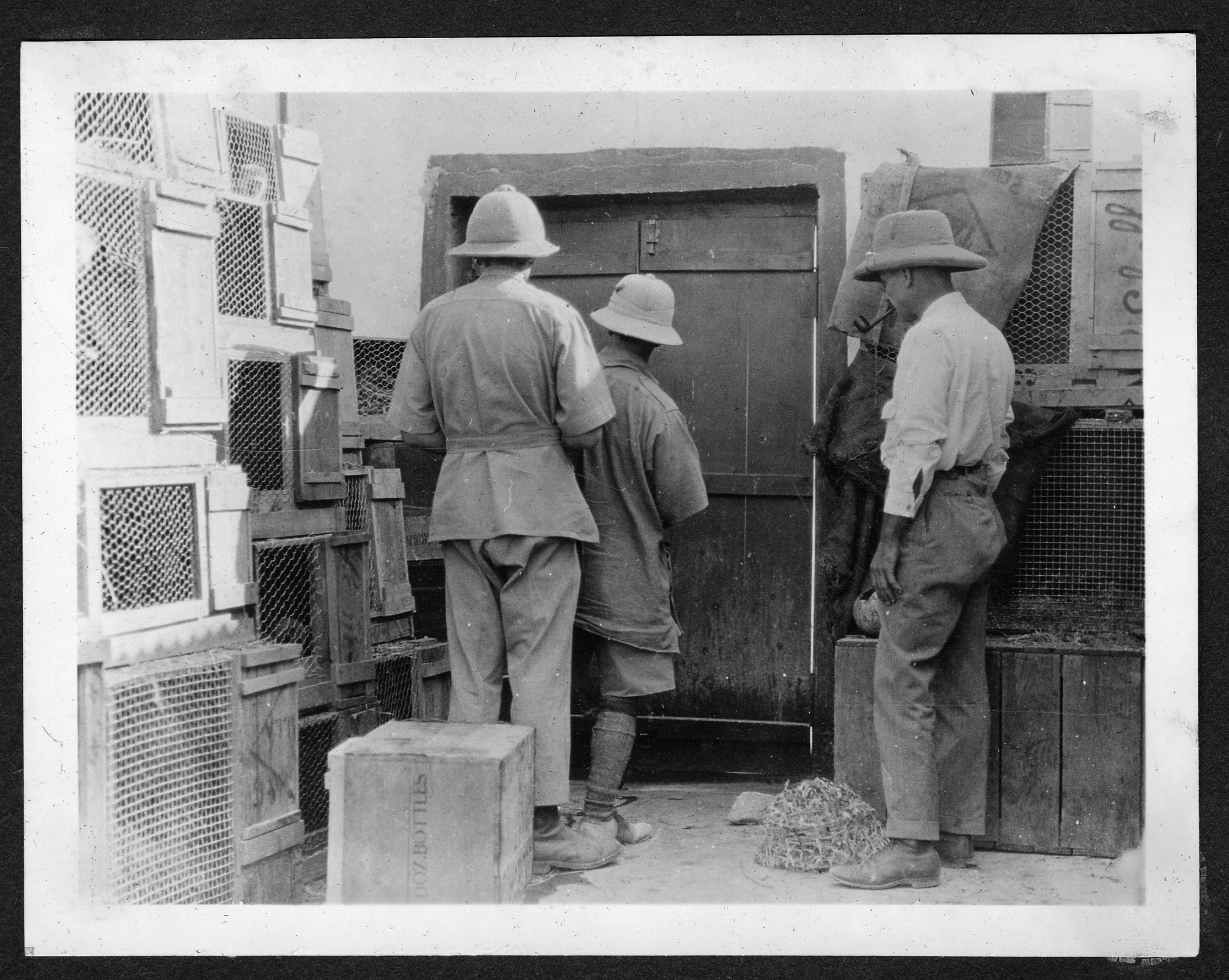 Three men standing near crates