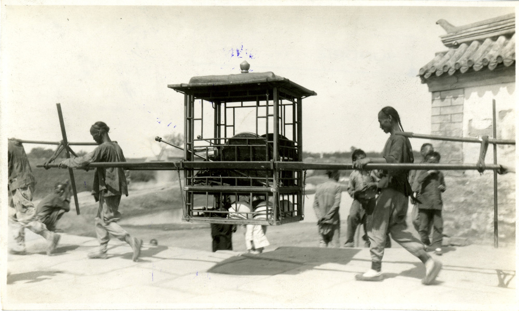 Men carrying a litter. [Stamp on back reads:] Hartung's Photo Shop Peking Legation Street.