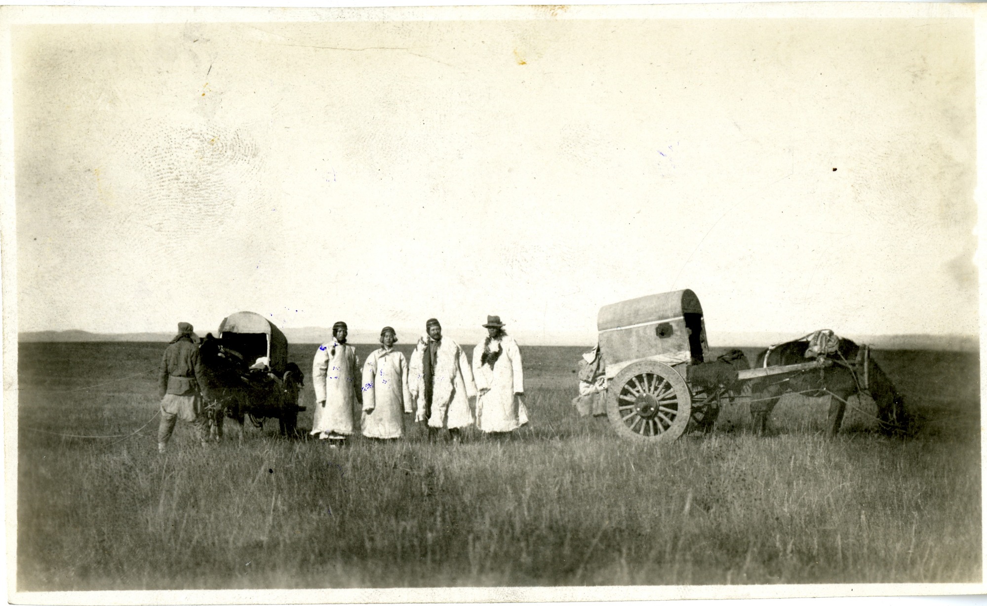 Group of people, carts, and horses or ponies in a field. Stamp on back reads: Hartung's Photo Shop Peking Legation Street.