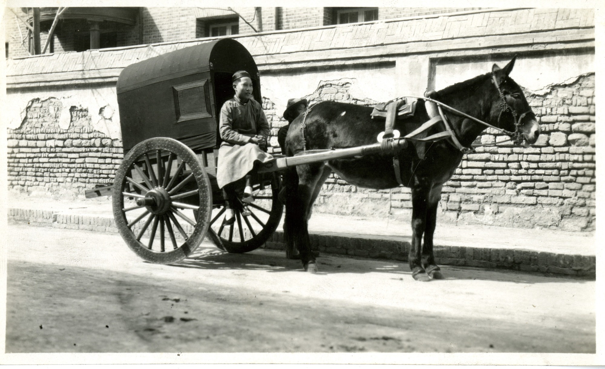 Horse pulling cart with Chinese man. Stamp on back reads: Hartung's Photo Shop Peking Legation Street.