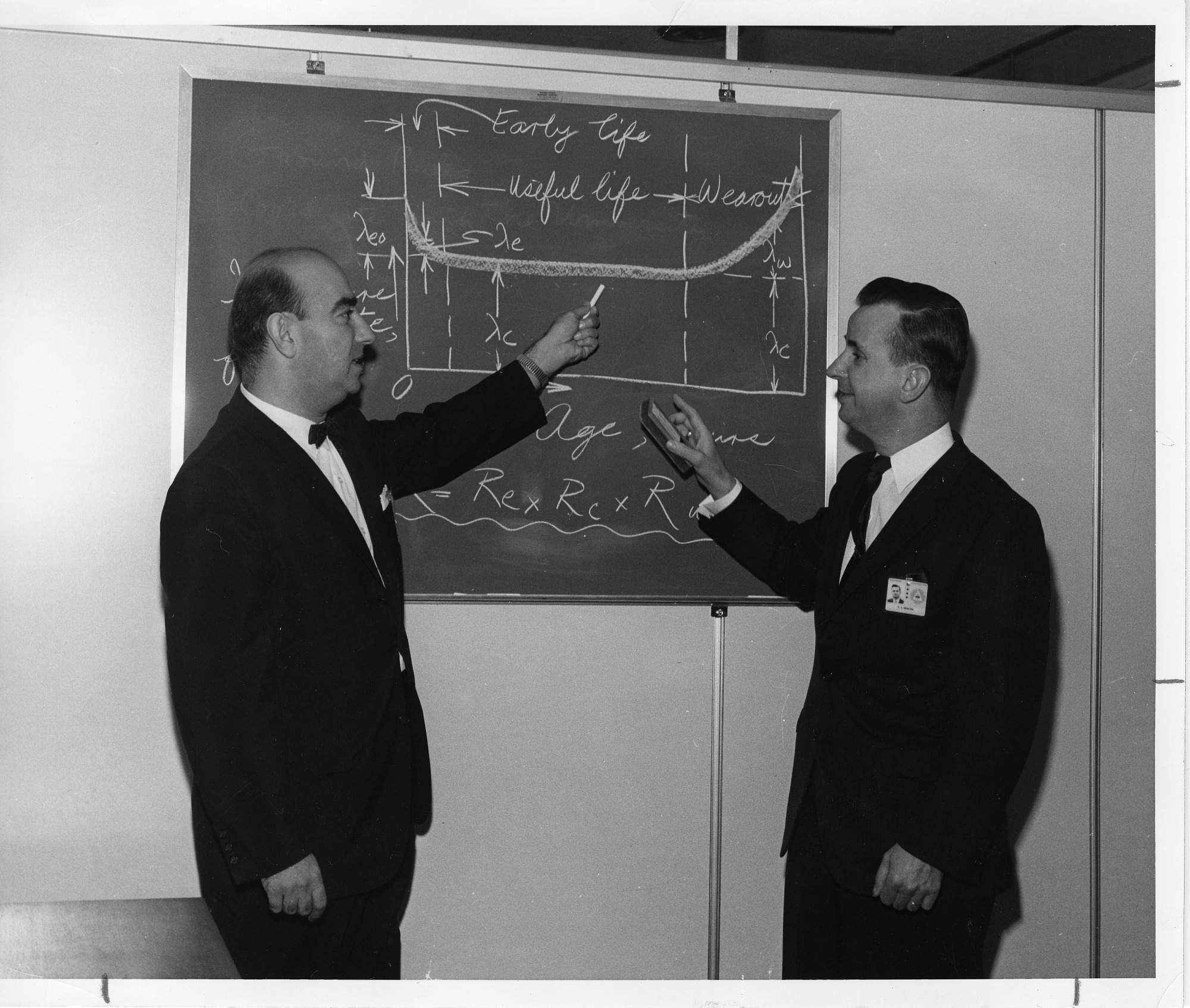 This Northrop Space Laboratory publicity photograph shows Professor Dimitri Kececioglu, Department of Aerospace and Mechanical Engineering, University of Arizona, and Northrop engineer Vincent J. Bracha.