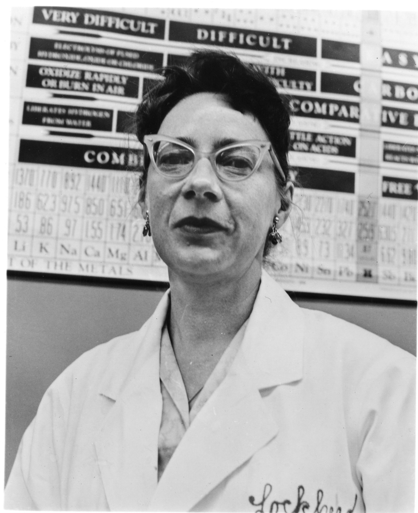 The caption accompanying this Lockheed Missiles and Space Company public relations photo reads: "Wanda G. Bradshaw is in the metallurgy and ceramics department of Lockheed's research laboratories. A graduate of Whittier College, with a B.S. in chemistry, she is engaged currently in measuring corrosion of metals. Her husband is an engineering writer for Lockheed. Their interests include baroque music."