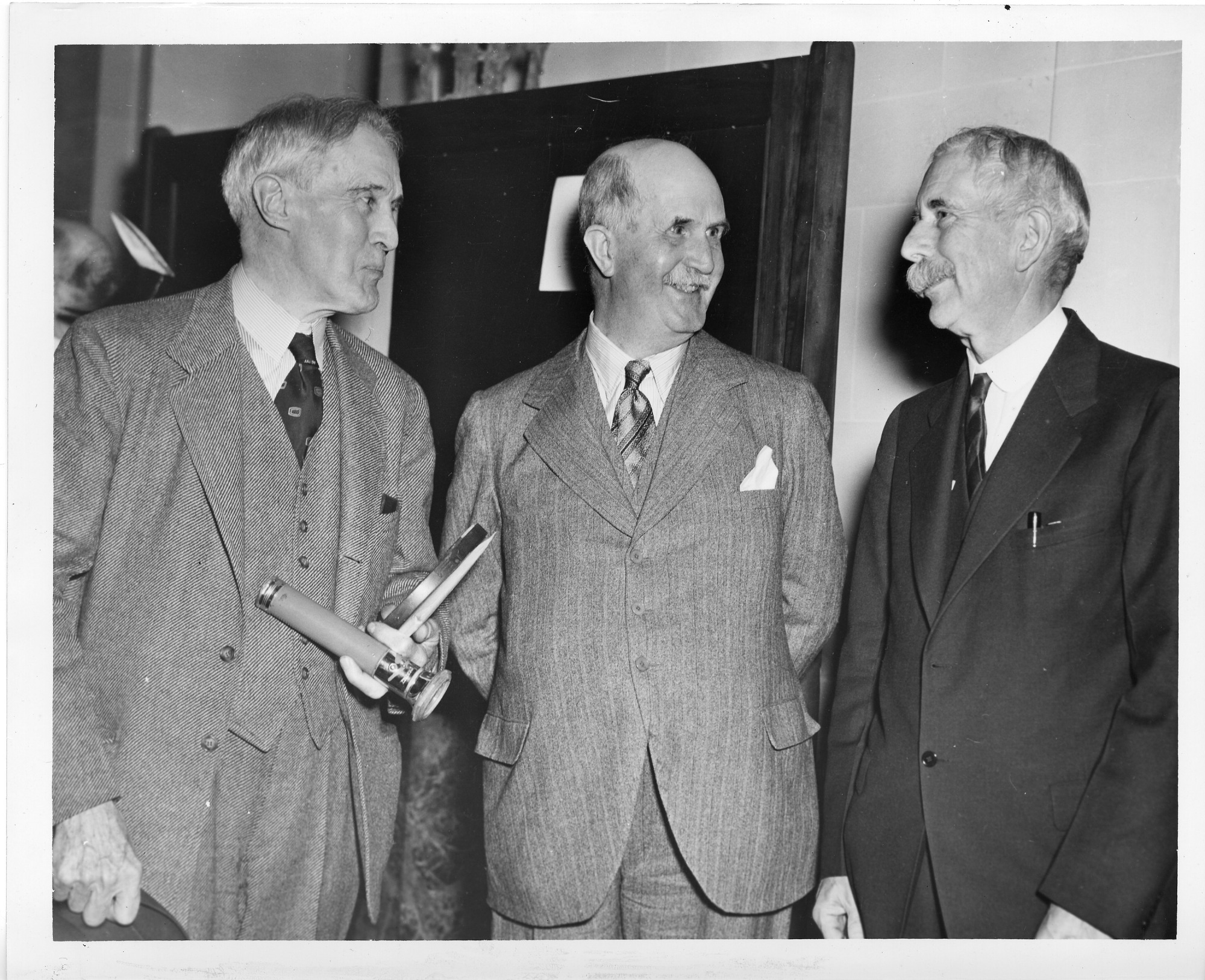 Robert Williams Wood (1868-1955) was professor of physics at Johns Hopkins University; Sir William Henry Bragg (1862-1942) was professor of physics at Cambridge University; and Charles Greeley Abbot (1872-1973) was Secretary of the Smithsonian Institution. They are shown at the NAS Spring 1939 meeting in Washington.