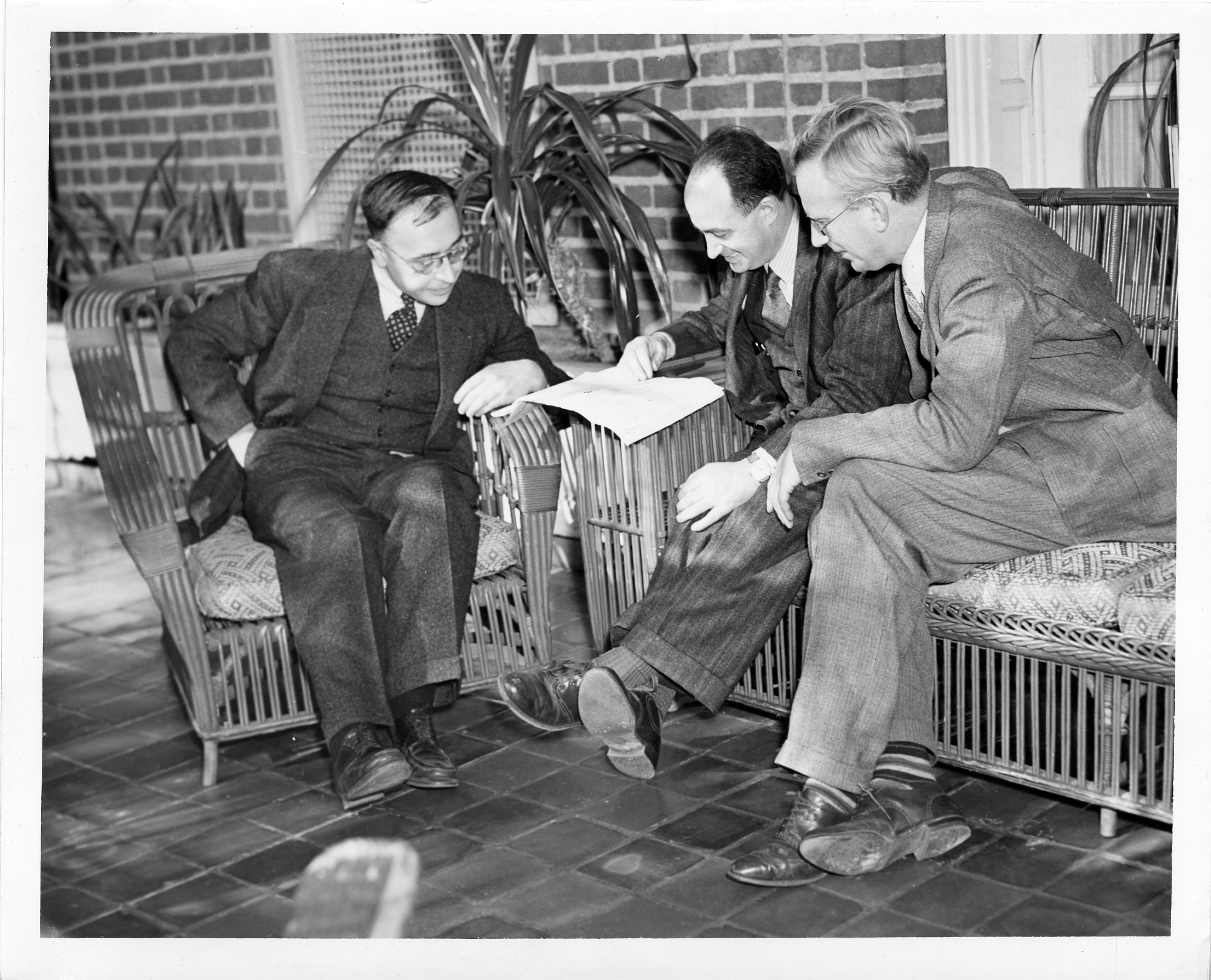 left to right: Gregory Breit (1899-1981), Professor of Physics, University of Wisconsin; Nobel laureate and physicist Enrico Fermi (1901-1954); and George Gamow (1904-1908), Professor of Physics, George Washington University. Fermi had immigrated to the United States on January 2, 1939, and had accepted an appointment at Columbia University. The physicists were attending the Fifth Washington Conference on Theoretical Physics, Washington, D.C., January 26 to 28, 1939.