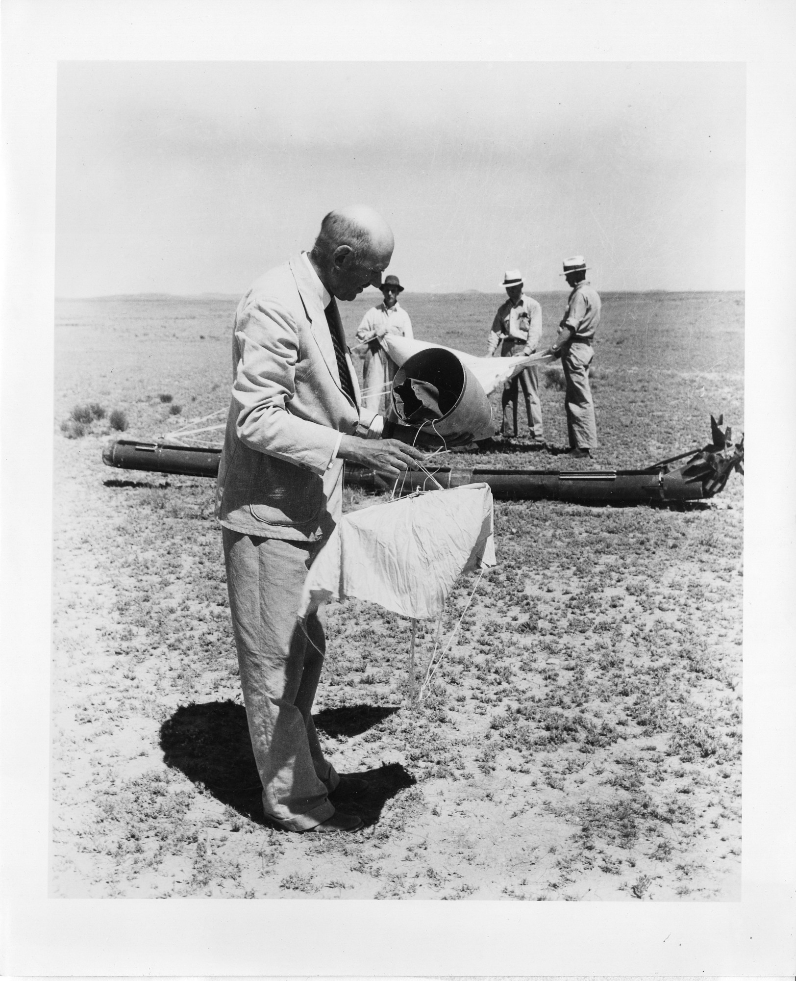Robert Hutchings Goddard (1882-1945) was a pioneer in modern rocket research, and on the faculty of Clark University. Goddard is shown at Roswell, New Mexico, test site in 1937; Goddard supplied this photo to Science Service.