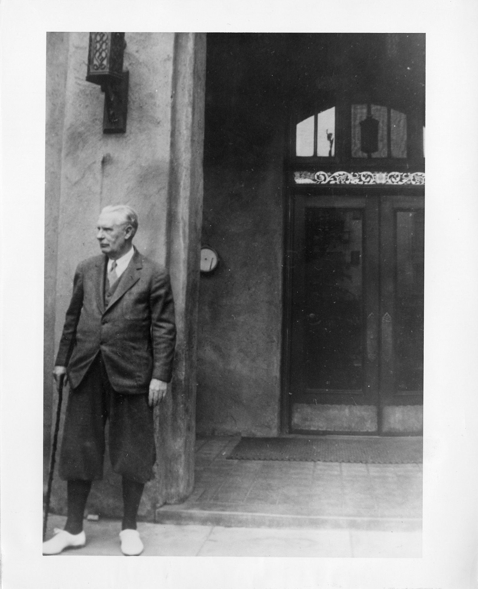 John Carroll Broderick is shown standing outside Scripps College, Claremont, California. An American architect, Broderick became involved in 1926 in helping to reproduce, by hand, the Book of Kells; in 1936 he was associated with Trinity College, Dublin, and on a lecture tour in U.S. about the Book of Kells.