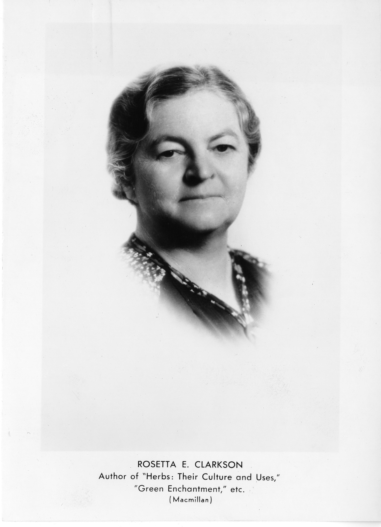 In 1940, Rosetta Elizabeth Shear Clarkson (1893-1950) was a high school English teacher in New Rochelle, New York. By 1942, when this publicity photograph was distributed, she was becoming known for her books on herbs and their medicinal and culinary uses.