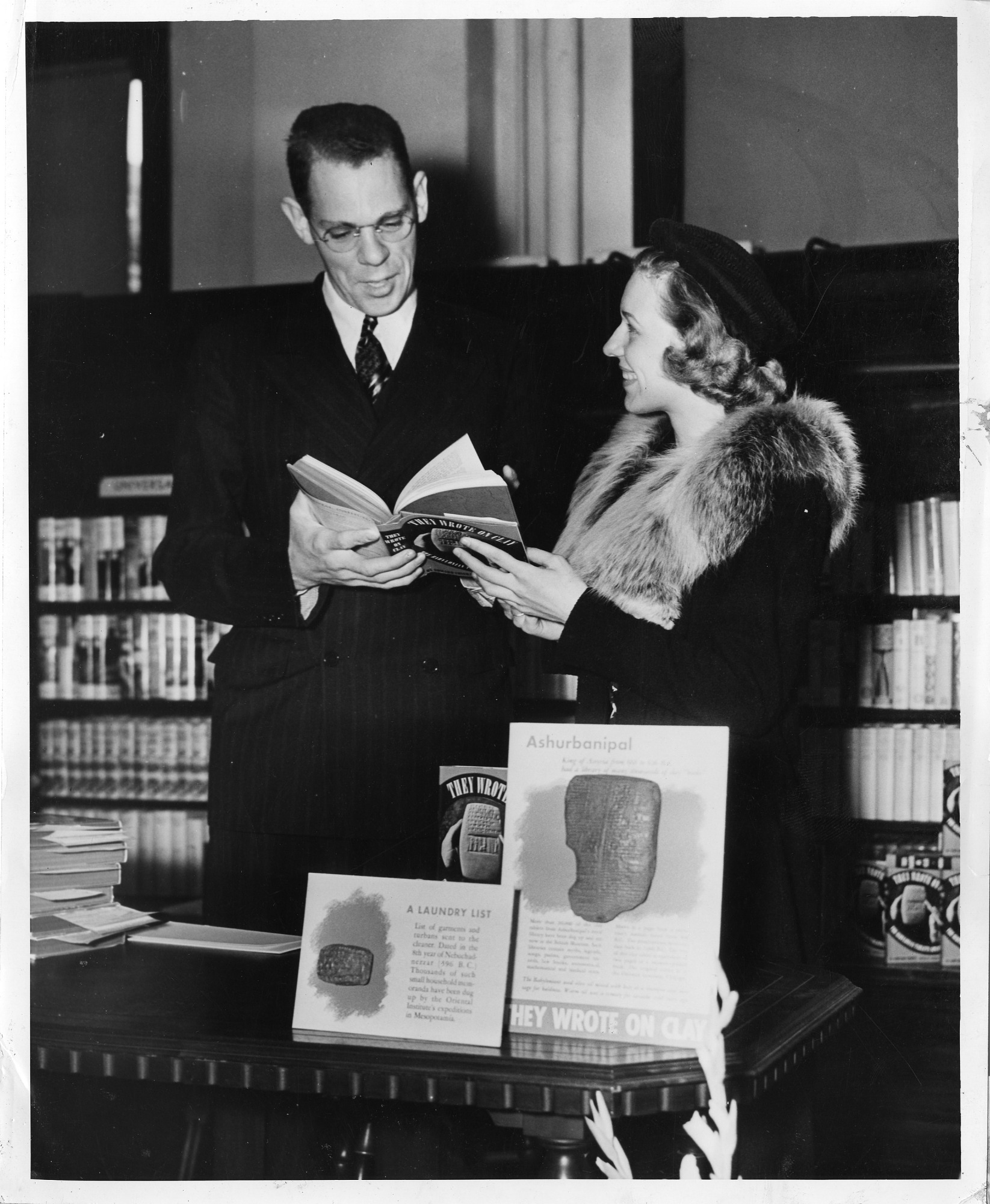 Archeologist George Glenn Cameron (1905-1979) taught at University of Chicago, 1932-1948, and founded University of Michigan's Department of Near Eastern Studies. He is shown in a bookstore with stacks of They Wrote on Clay (1938), a book written by Edward Chiera and completed by Cameron after Chiera's death.