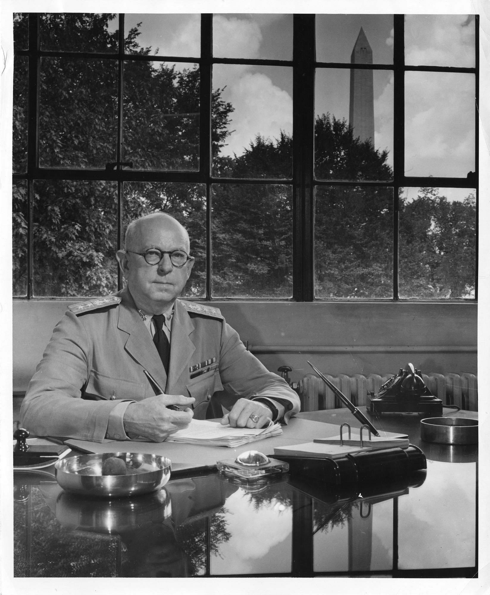 Howard Gardiner Bowen (1883-1965) was Director of Naval Research Laboratory, 1939-1942; in 1945, when the photograph was taken, he was a Rear Admiral and chief of the Navy's Office of Research and Inventions.