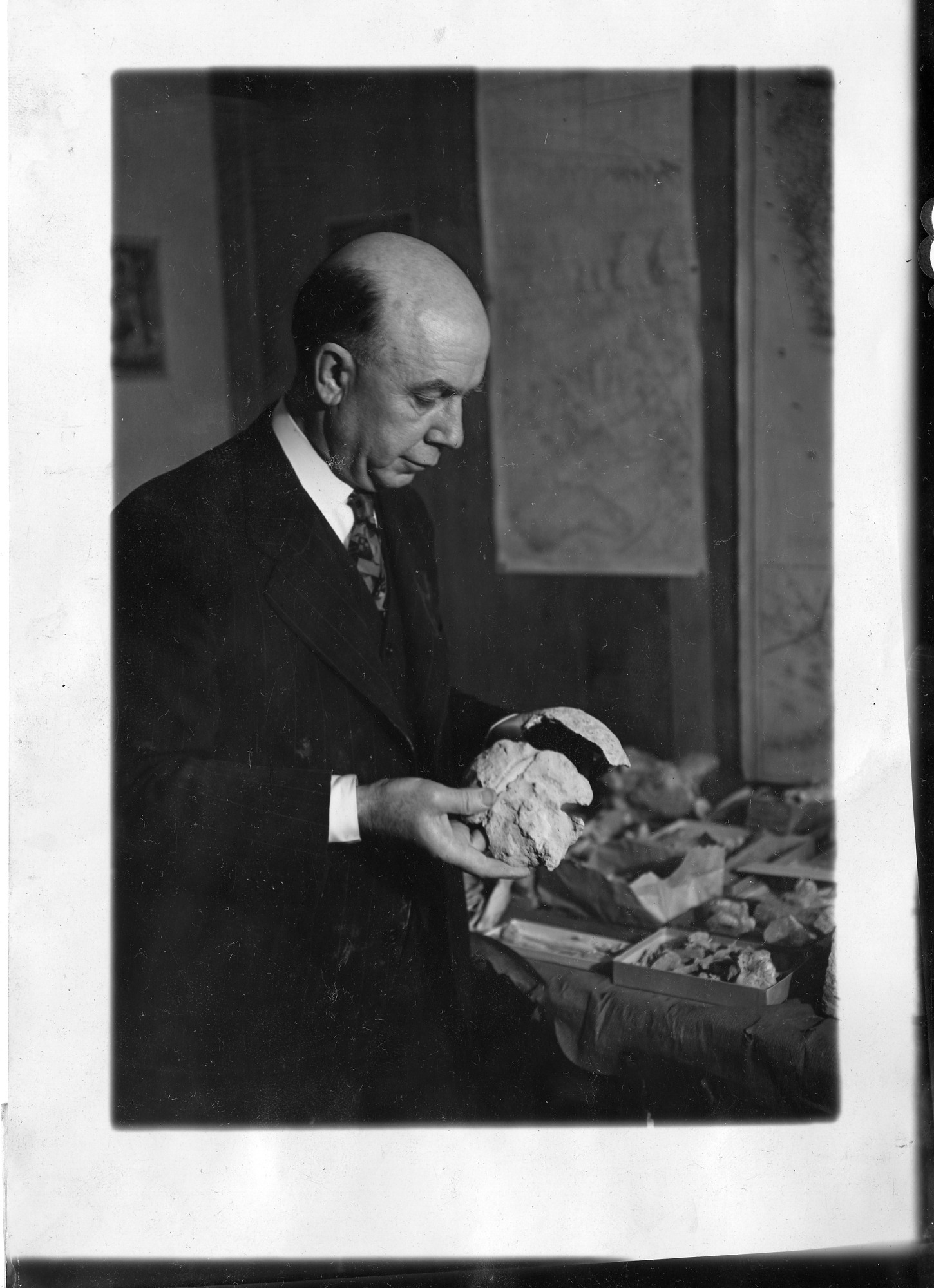 Ornithologist William Alanson Bryan (1875-1942) was Director of the Los Angeles Museum of History, Science, and Art, 1919-1939; he is shown at a desk "holding portions of the human skull secured from Conkling Cavern."
