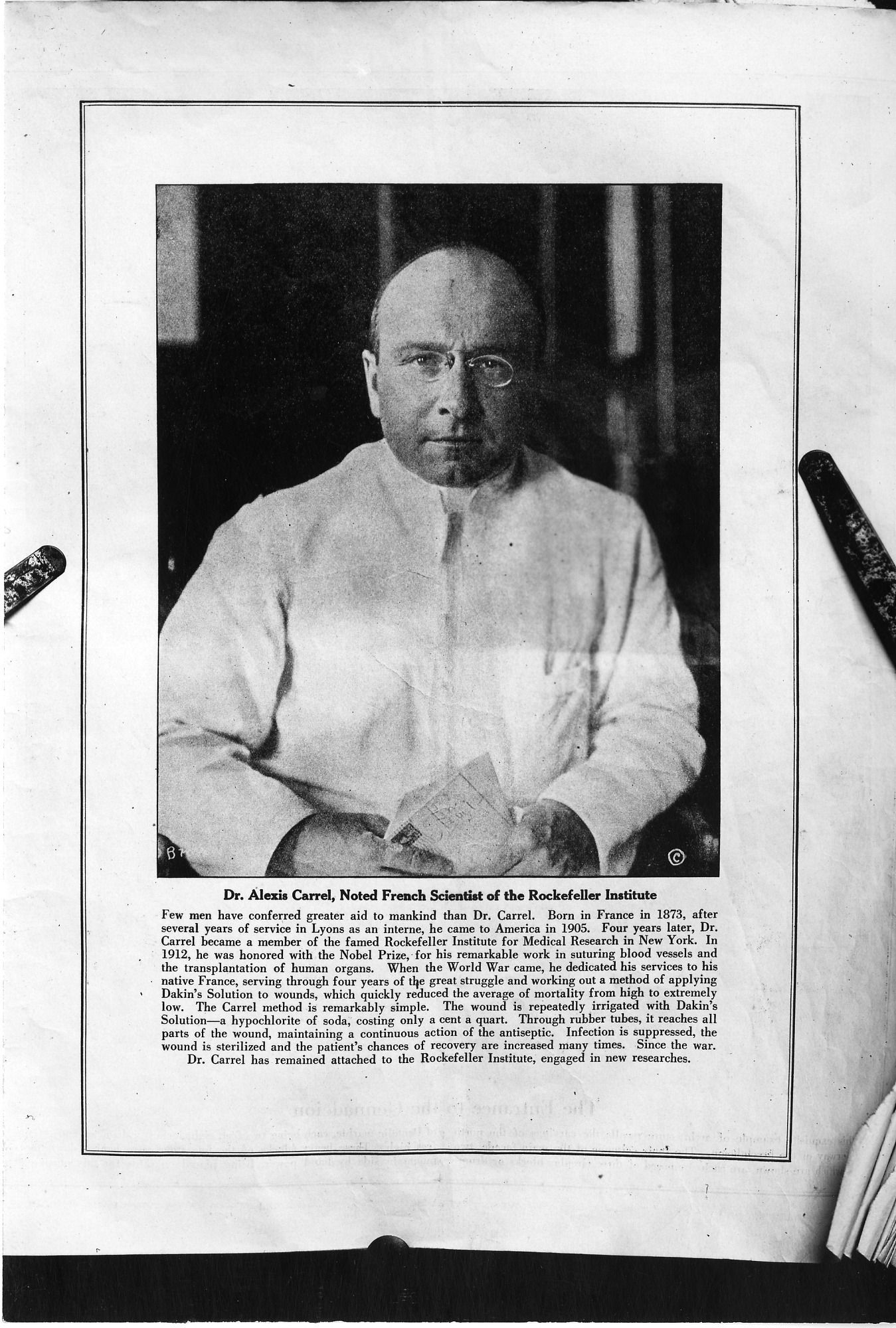 Rockefeller Institute for Medical Research biologist and surgeon Alexis Carrel (1873-1944) won Nobel Prize in medicine in 1912. This is a reproduction of a magazine page.