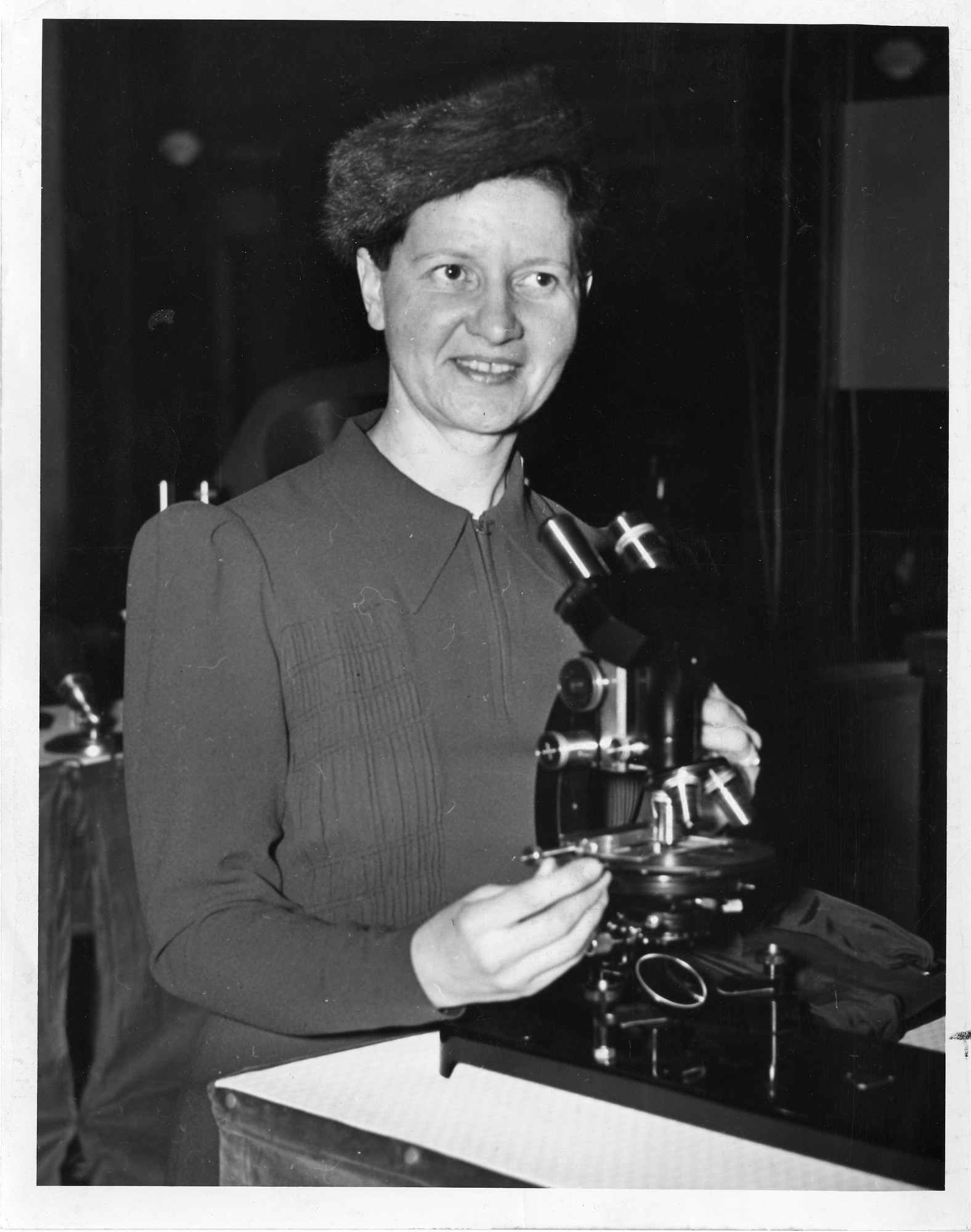 Wanda Margarite Kirkbride Farr (1895-1983), sitting in lab with microscope