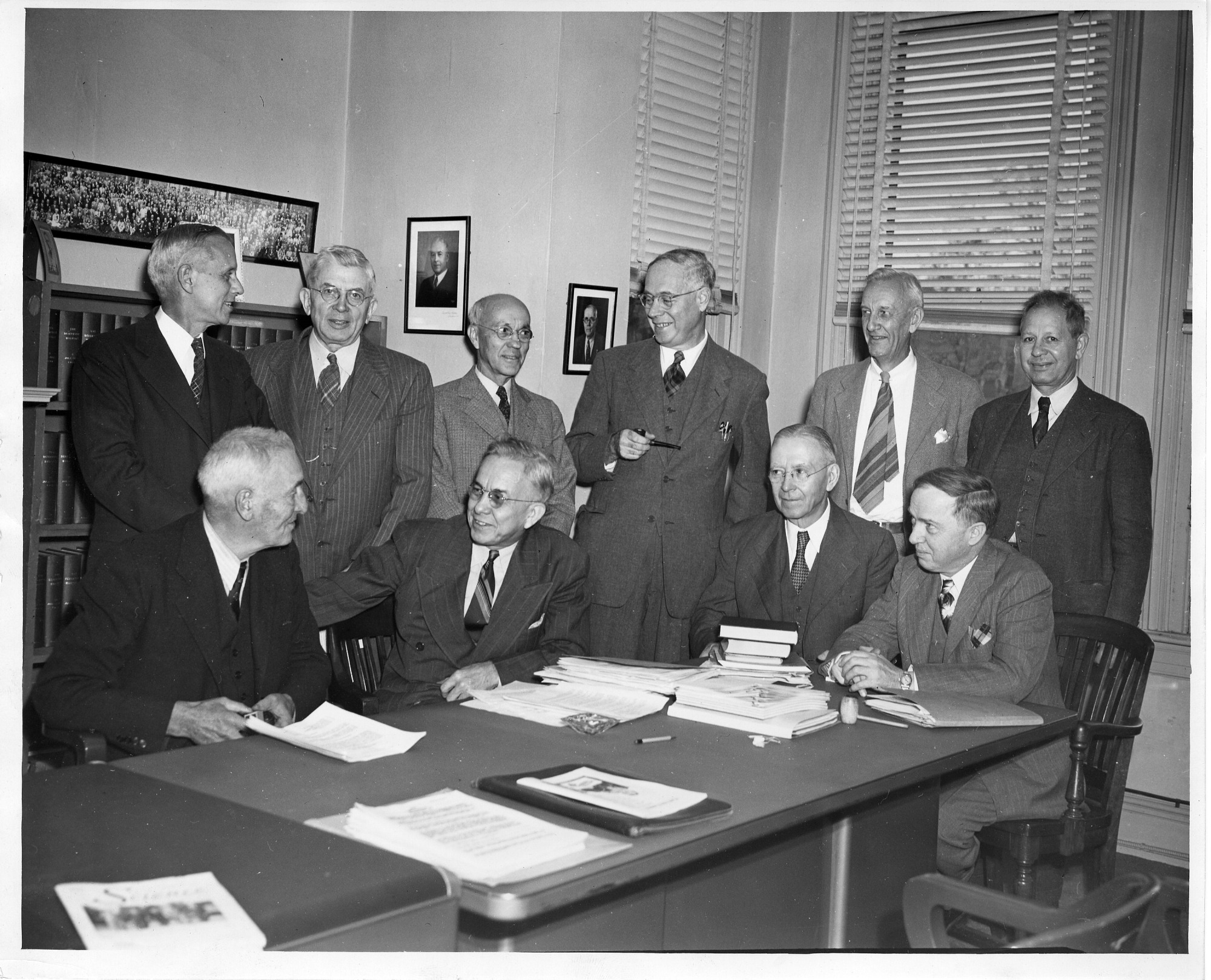 (seated left to right): Anton Julius Carlson, Kirtley Mather, Forest Ray Moulton, Harlow Shapley; (standing left to right): Edmund Ware Sinnott, George Alfred Baitsel, Fernandus Payne, Karl Lark-Horovitz, Walter Richard Miles, Elvin Charles Stakman
