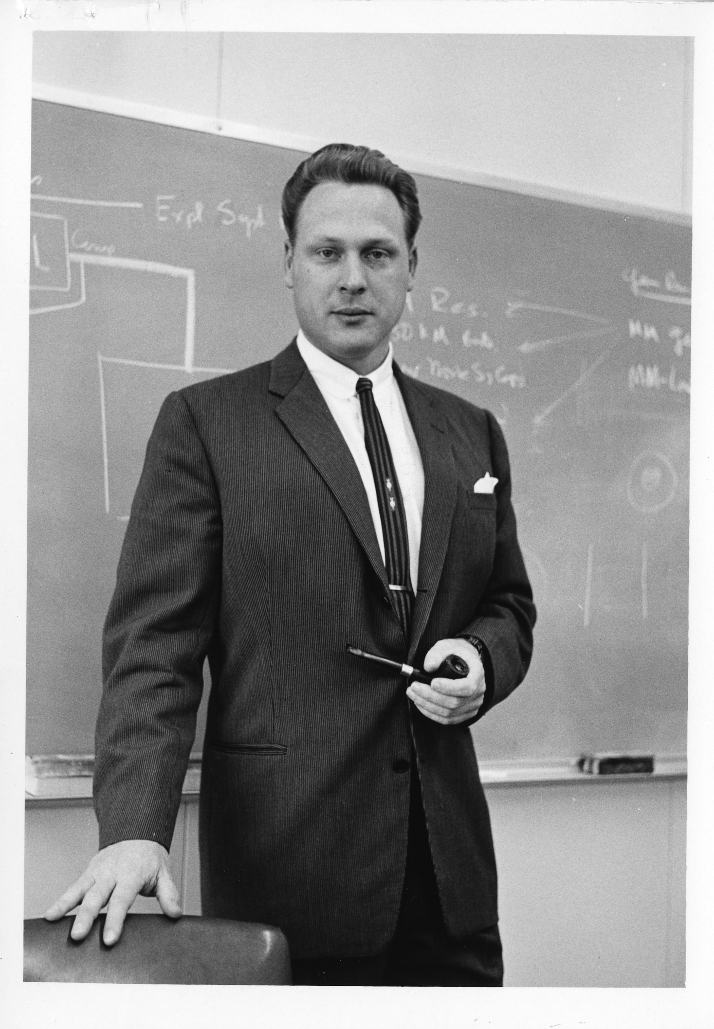 In 1960s, when this photograph was distributed, the California Chamber of Commerce had just named Malcolm R. Currie (b. 1927) one of the state's "outstanding young men." Currie served as U.S. Undersecretary of Research and Engineering, in the Department of Defense, 1969-1973, and president of Hughes Aircraft Corporation, 1973-1977.