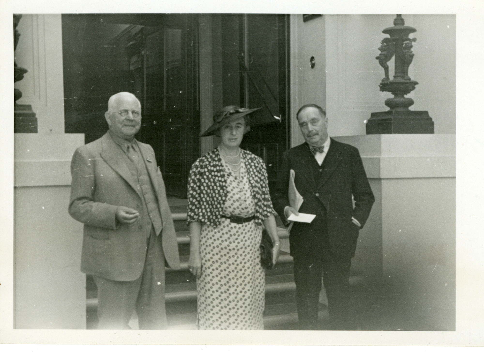 Sir Richard Arman Gregory (1864-1952), Editor of Nature; his wife Dorothy Page Gregory (Lady Gregory); and writer H. G. (Herbert George) Wells (1866-1946), outside the University Arms Hotel, Cambridge, during a British Association for the Advancement of Science (BAAS) meeting. Richard Gregory had become friends with Wells while training to be a science teacher at the Royal College of Science, South Kensington, London, where Wells was also a student. Gregory served as editor of Nature, 1919-1938, and as BAAS President during World War II.