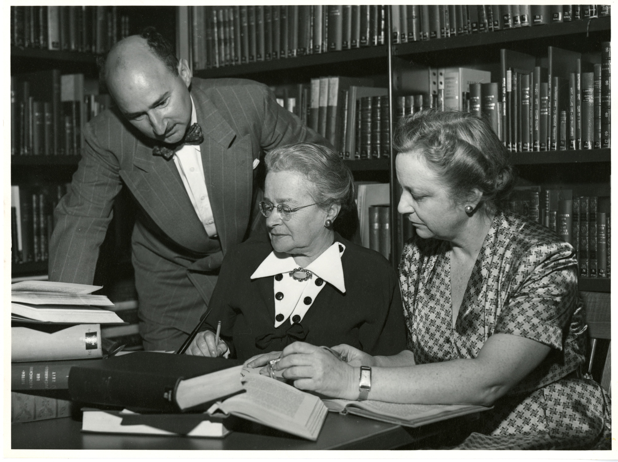 Kinsey Institute for Sex Research translation staff, shown in the Institute's library. Left to right: Henry H. H. Remak (1916-2009), Professor of Comparative Literature, Indiana University; Mrs. Leser (who translated German and French sources); and Cornelia V. Christenson (1903-1993), in charge of reference research.
