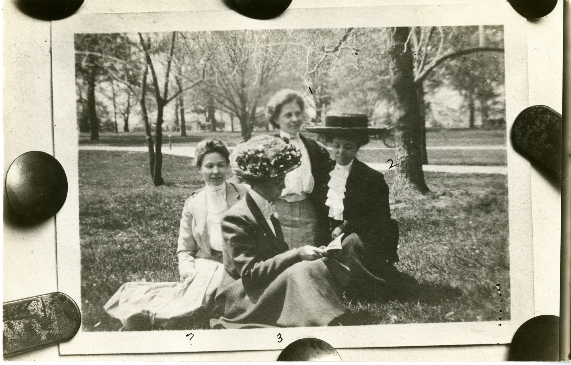 (left to right): An unidentified woman (possibly Alice Haskins) sitting with Lucia McCulloch (1873-1955), Clara H. Hasse (1880?-1926), and Mary K. Berger