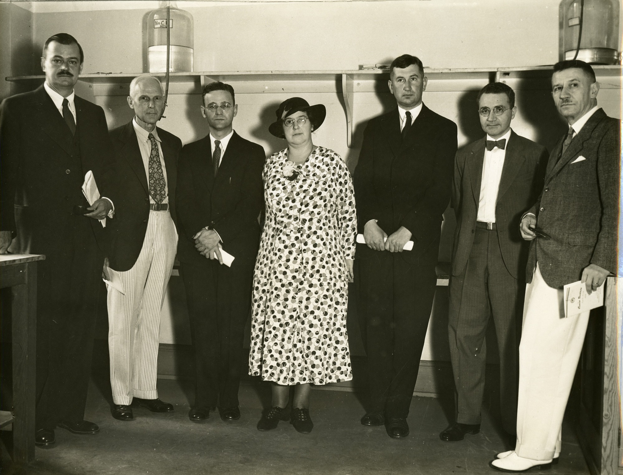 left to right: Clarence Cook Little (1888-1971); Edgar Allen (1892-1943); Howard Bancroft Andervont (1898-1981); Madge Thurlow Macklin (1893-1962); Leiv Kreyberg (b. 1896); Gioacchino Failla (1891-1961); and Henri Coutard (1876-1950)