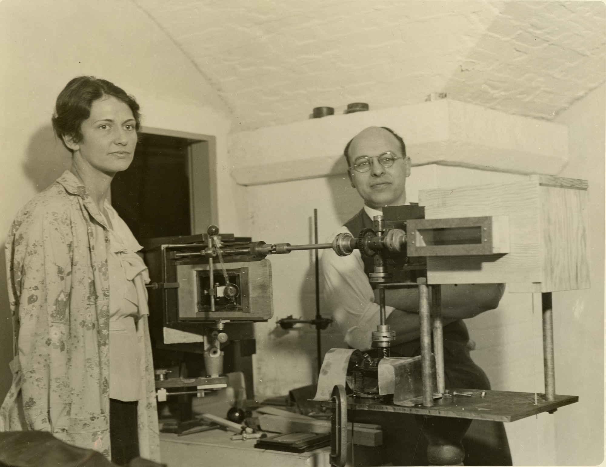 An unidentified woman and Edward Dorris McAlister (b. 1901) are shown working at the Smithsonian Institutions Division of Radiation and Organisms in Cambridge, Massachusetts. The apparatus shown was being used to measure the strength of ultraviolet radiation by killing algae. After earning a Ph.D. at University of California, Berkeley, in 1927, McAlister taught at the University of Oregon, 1927-1930, and then worked for the Smithsonian, 1930-1941. His specialty was infrared spectroscopy and instrumentation, and biophysics.