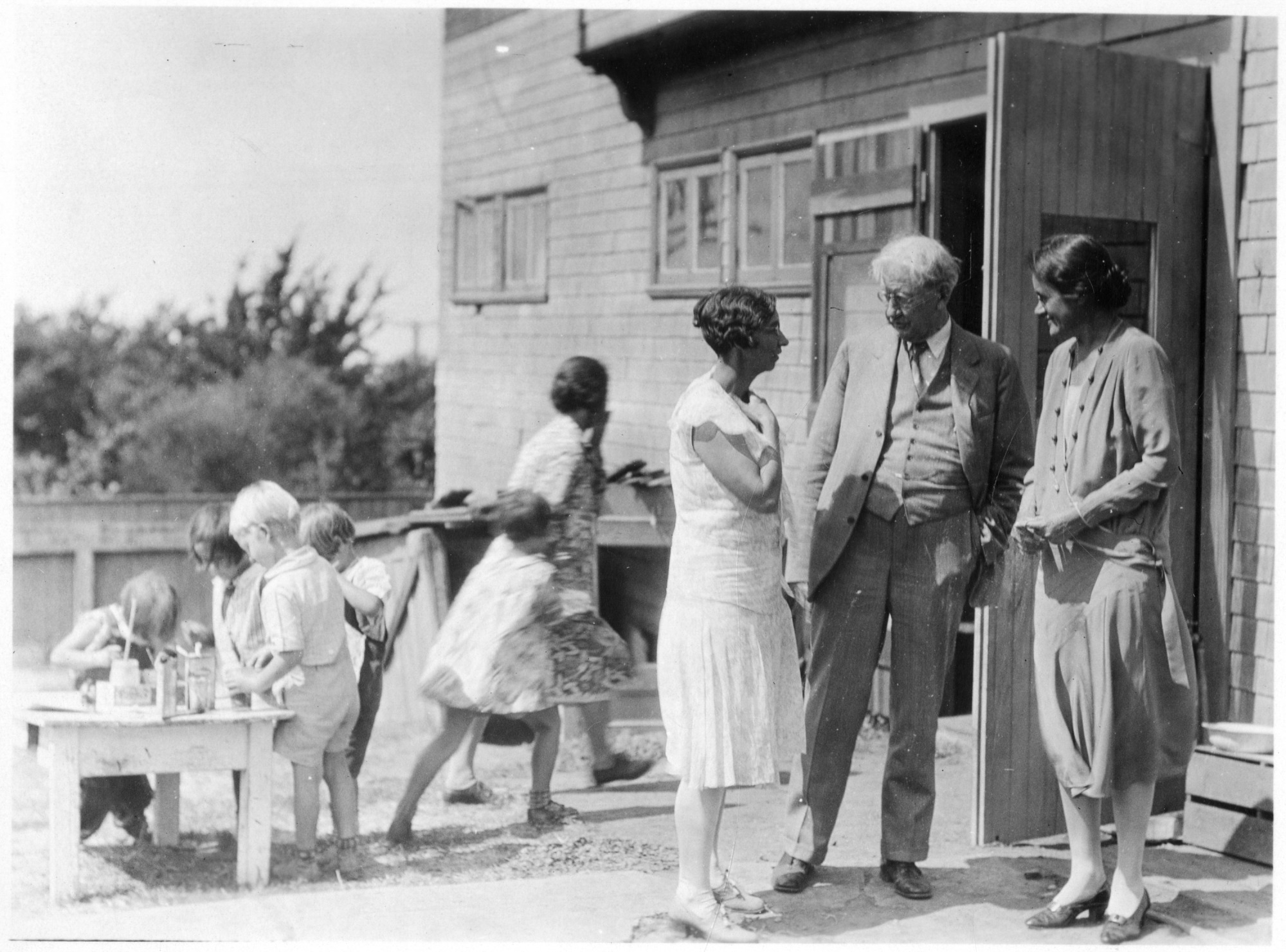 Left to right: Unidentified woman, William Emerson Ritter (1856-1944) (second from right), and Edna Watson ("Betty") Bailey (1883-1973) (far right), standing at the Community Nursery School, Berkeley, California. Bailey was a professor of education at the University of California and close friend and protǧ ǒf the Ritters.