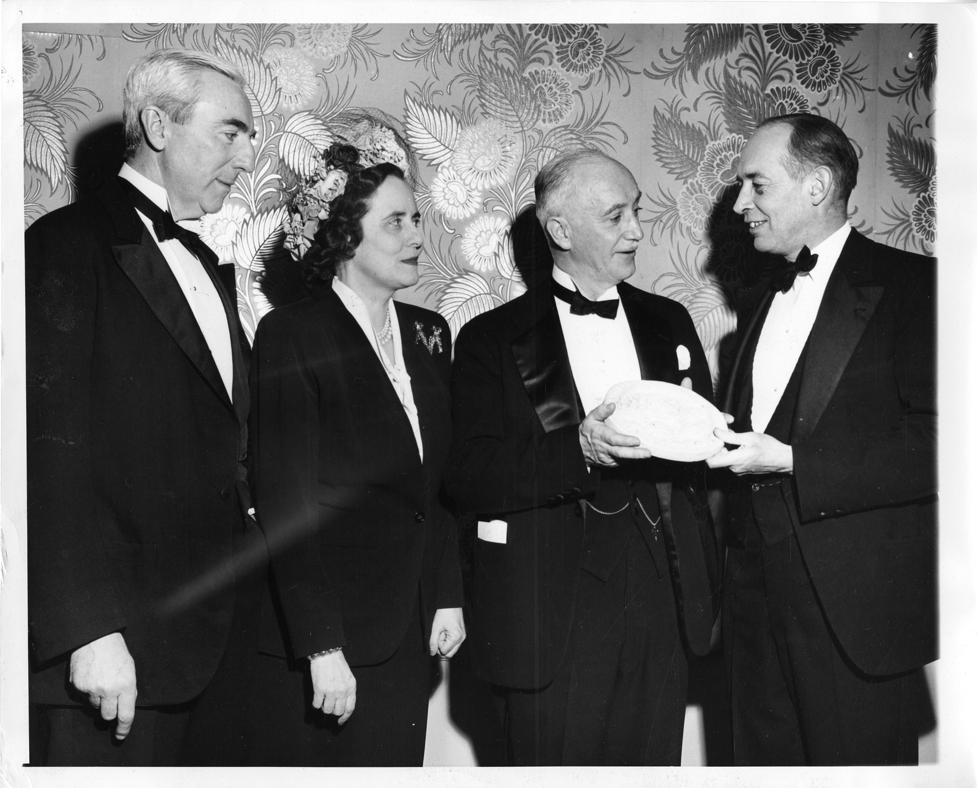 left to right: Physician John Rock; philanthropist Mary Woodard Lasker (1900-1994), physician Richard Norris Pierson, Sr.; and Cornelius P. Trowbridge (1898?-1973). Trowbridge (President of the Planned Parenthood Federation board) was presenting a Lasker medallion to Pierson and Rock. Lasker was co-donor of the Albert and Mary Lasker Awards. Rock, a professor of gynecology at Harvard Medical School, was cited for his research into the cause and cure of sterility. Medical researcher Pierson was praised for his efforts in obtaining medical recognition for Planned Parenthood.