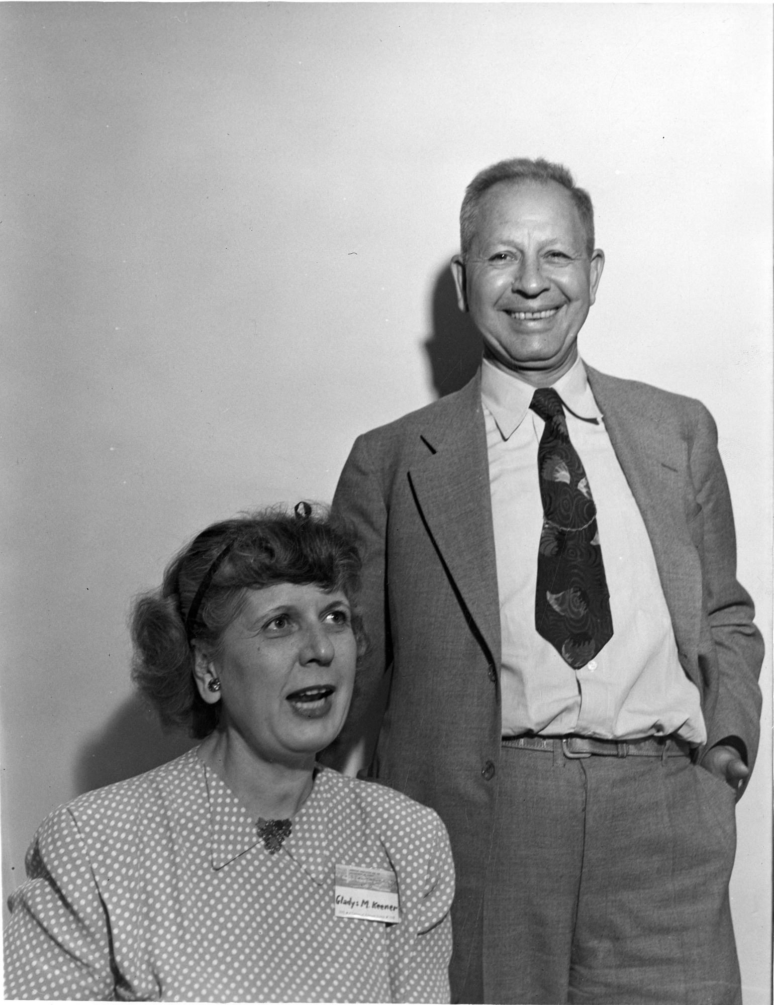 left to right: Gladys McLaughlin Schramm Keener (ca. 1897-1961) and Elvin Charles Stakman (1885-1979) in 1949. Stakman was then serving as President of the American Association for the Advancement of Science (AAAS) and Keener was Executive Editor of Scientific Monthly. She later became Executive Editor of Science, 1950-1953. In 1953, Keener and scientist Howard A. Meyerhoff, chairman of the editorial board, became involved in a political dispute with the current AAAS president (Edward U. Condon) and president-elect (Warren Weaver) over editorial policy at Science and Scientific Monthly, and they both resigned (see "Two Editors Quit Top Science Group," New York Times, May 27, 1953). Kenner joined the Scientific Manpower Council and later became a partner in a minerals consulting firm.