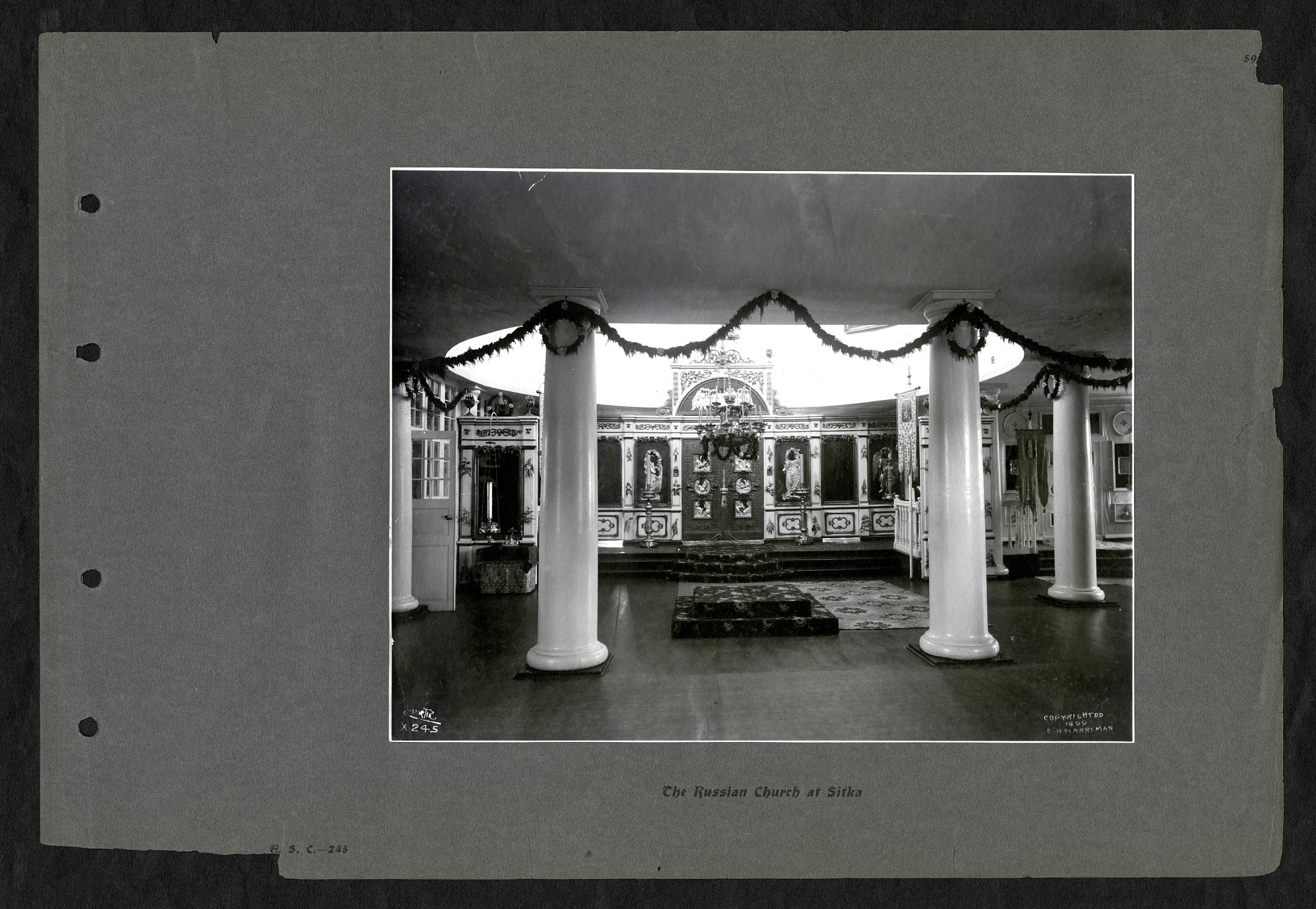 Photo of the interior of an old Russian church in Sitka, Alaska. The interior is still decorated, including garlands strung between the columns. Page 59 of a photo album documenting the Harriman Alaska Expedition, Volume 1. This image is part of a series of photographs taken by various members of the Harriman Alaska Expedition of 1899, which was cosponsored by Edward Henry Harriman, president of the Union Pacific Railroad and the Washington Academy of Sciences. Originally conceived by Harriman as a big-game hunt, the enterprise was transformed into a scientific expedition upon the advice of Clinton Hart Merriman, chief of the Bureau of Biological Survey.