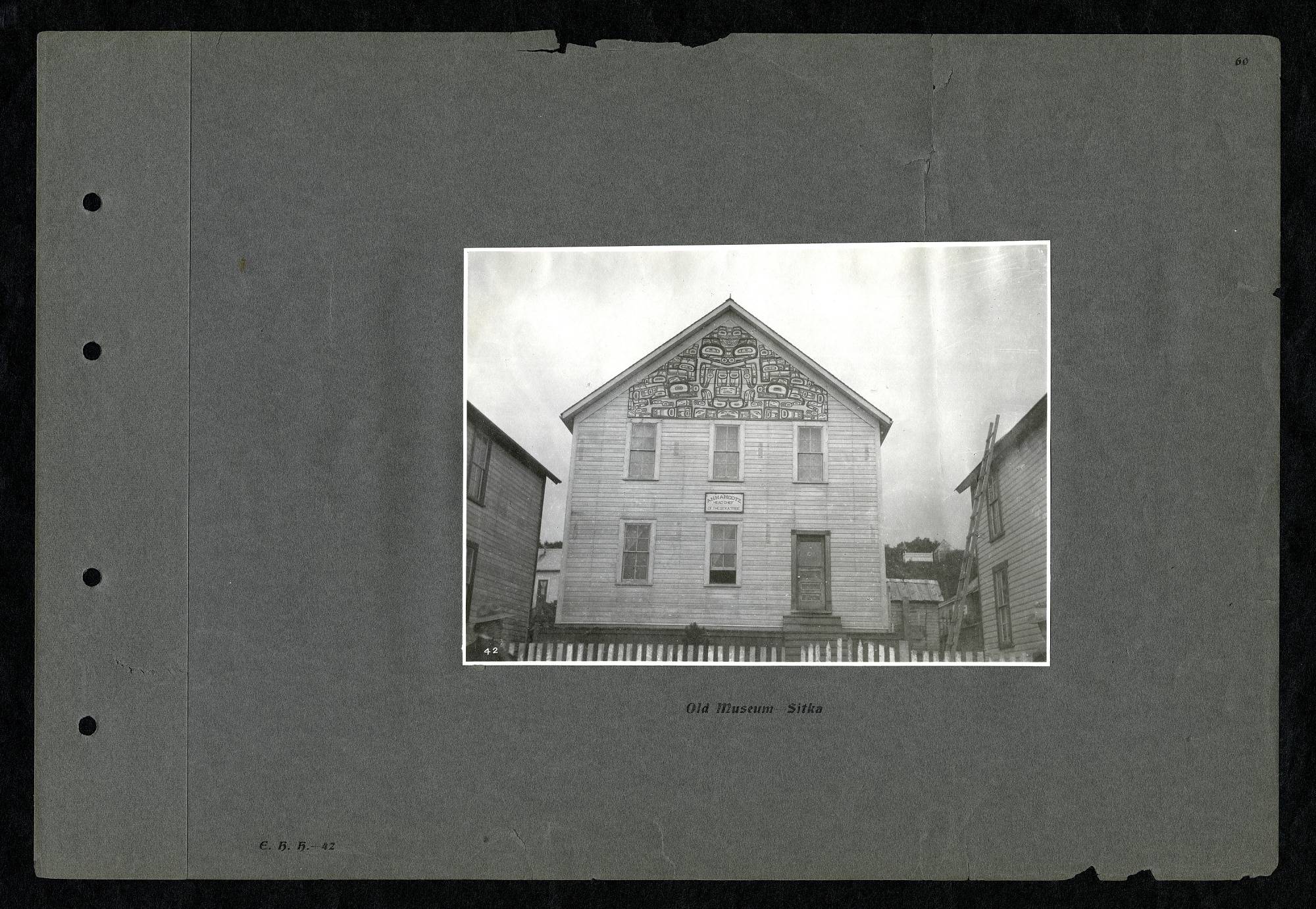 Photo of the exterior of an old museum in Sitka, Alaska. The upper portion of the exterior is decorated with Tlingit art. Page 60 of a photo album documenting the Harriman Alaska Expedition, Volume 1. This image is part of a series of photographs taken by various members of the Harriman Alaska Expedition of 1899, which was cosponsored by Edward Henry Harriman, president of the Union Pacific Railroad and the Washington Academy of Sciences. Originally conceived by Harriman as a big-game hunt, the enterprise was transformed into a scientific expedition upon the advice of Clinton Hart Merriman, chief of the Bureau of Biological Survey.