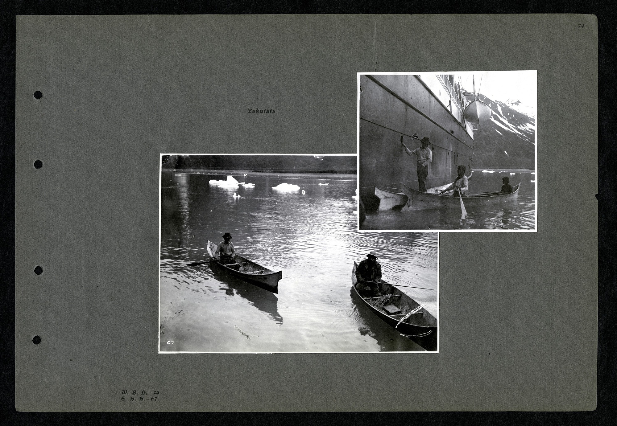 Two photos of Yakutats (Tlingits). The photo on the top right features three Yakutats with two canoes pulled alongside a larger boat. The photo on the bottom left features two men, each in his own canoe. Page 79 of a photo album documenting the Harriman Alaska Expedition, Volume 1. This image is part of a series of photographs taken by various members of the Harriman Alaska Expedition of 1899, which was cosponsored by Edward Henry Harriman, president of the Union Pacific Railroad and the Washington Academy of Sciences. Originally conceived by Harriman as a big-game hunt, the enterprise was transformed into a scientific expedition upon the advice of Clinton Hart Merriman, chief of the Bureau of Biological Survey.