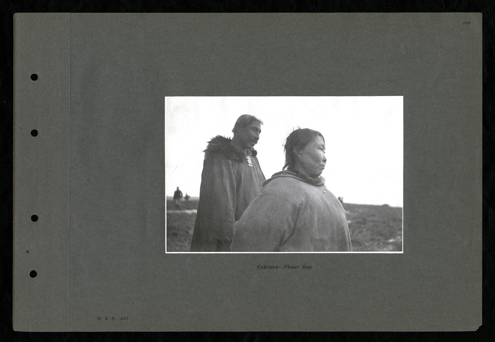 Photo of an Eskimo man and an Eskimo woman at Plover Bay. Page 158 of a photo album documenting the Harriman Alaska Expedition, Volume 2. This image is part of a series of photographs taken by various members of the Harriman Alaska Expedition of 1899, which was cosponsored by Edward Henry Harriman, president of the Union Pacific Railroad and the Washington Academy of Sciences. Originally conceived by Harriman as a big-game hunt, the enterprise was transformed into a scientific expedition upon the advice of Clinton Hart Merriman, chief of the Bureau of Biological Survey.