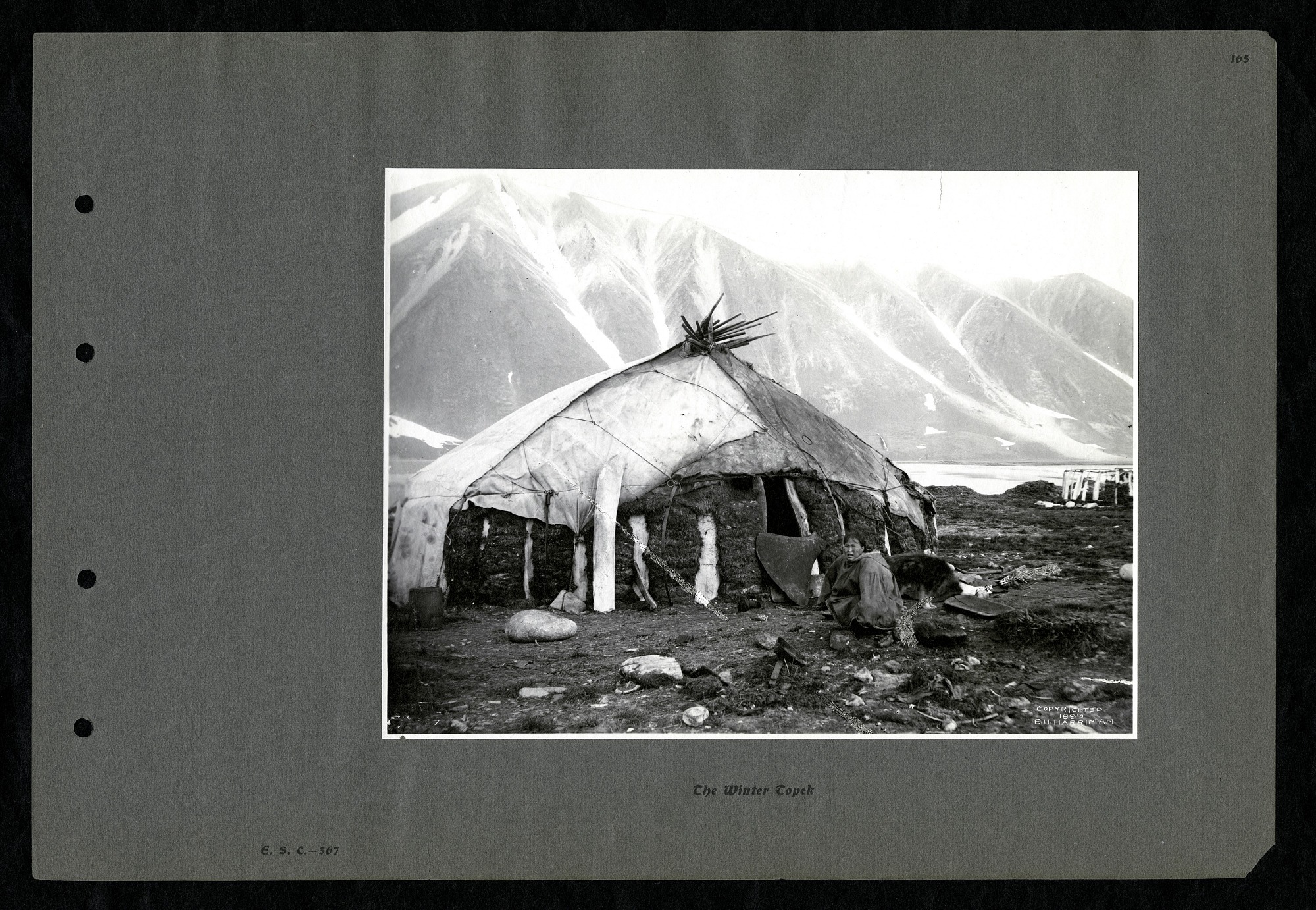 Photo of the winter topek. An Eskimo is crouching in front of the topek. Mountains are in the background. Page 165 of a photo album documenting the Harriman Alaska Expedition, Volume 2. This image is part of a series of photographs taken by various members of the Harriman Alaska Expedition of 1899, which was cosponsored by Edward Henry Harriman, president of the Union Pacific Railroad and the Washington Academy of Sciences. Originally conceived by Harriman as a big-game hunt, the enterprise was transformed into a scientific expedition upon the advice of Clinton Hart Merriman, chief of the Bureau of Biological Survey.