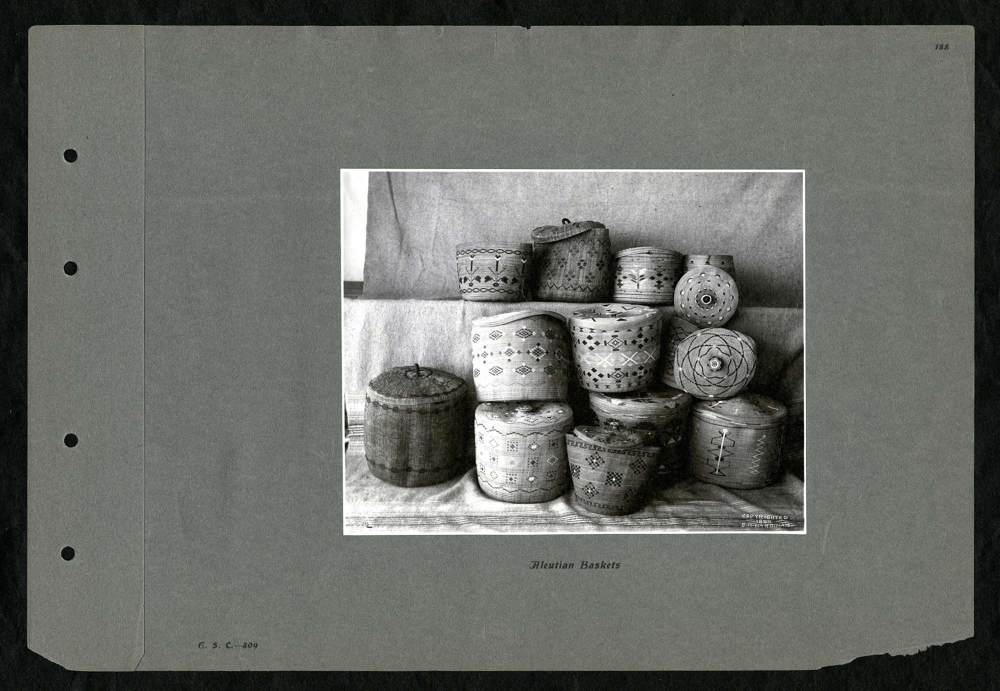 Photo of Aleutian baskets against cloth backdrop. Page 188 of a photo album documenting the Harriman Alaska Expedition, Volume 2. This image is part of a series of photographs taken by various members of the Harriman Alaska Expedition of 1899, which was cosponsored by Edward Henry Harriman, president of the Union Pacific Railroad and the Washington Academy of Sciences. Originally conceived by Harriman as a big-game hunt, the enterprise was transformed into a scientific expedition upon the advice of Clinton Hart Merriman, chief of the Bureau of Biological Survey.