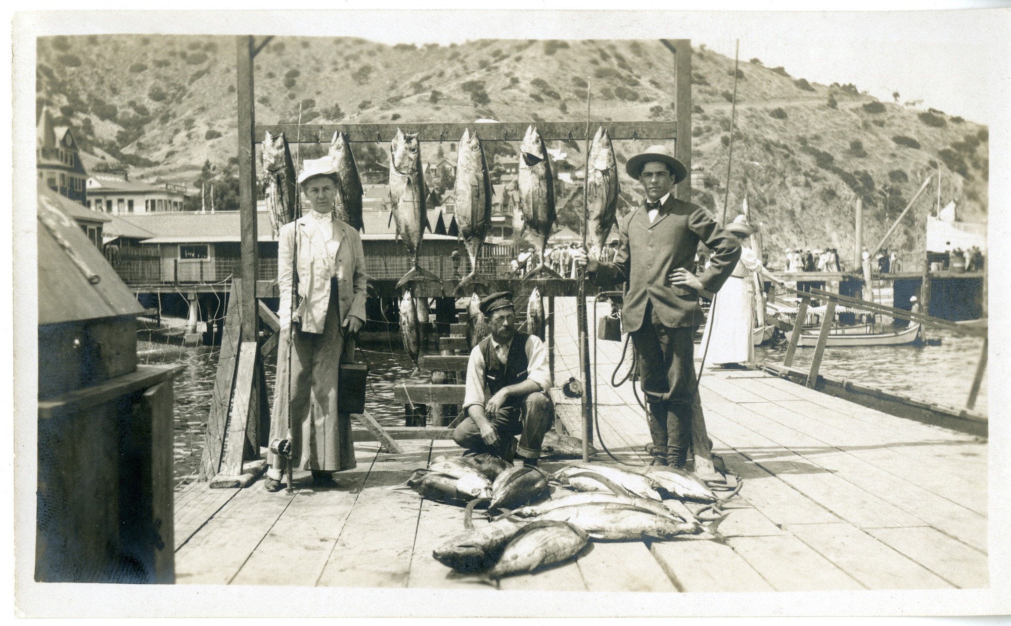 Pictured are three people on a dock, most likely at Catalina Island, California. Fish are piled on and hanging from the dock, and two of the people are holding fishing poles.