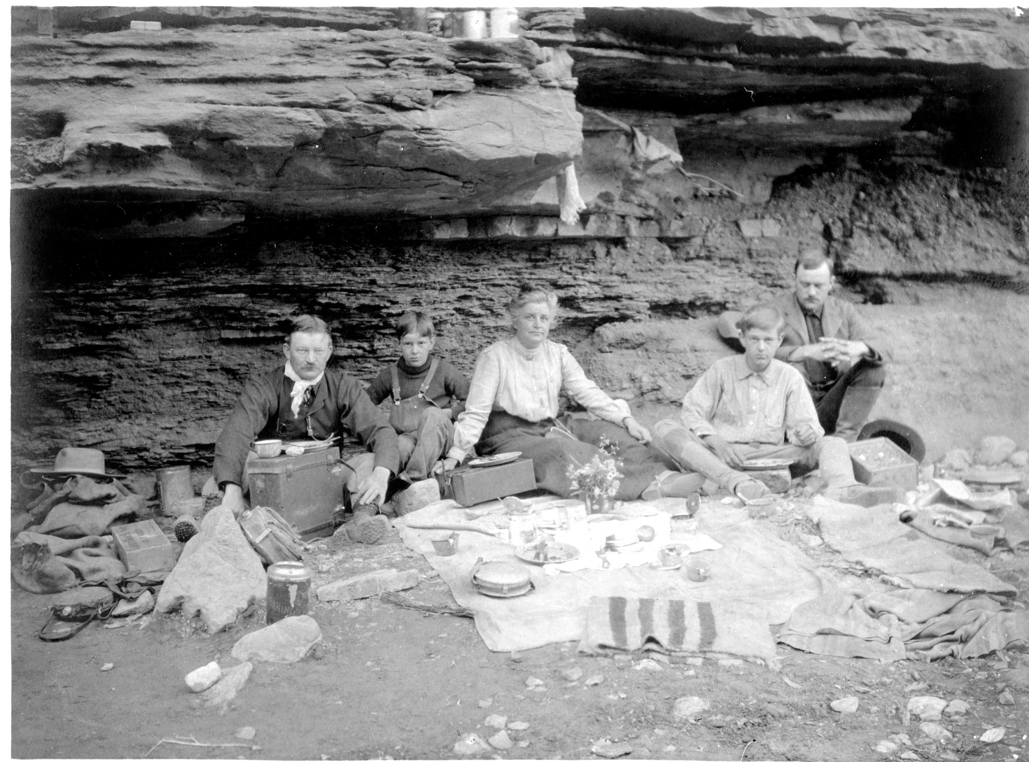 Pictured (left to right) are N.W. Corkhoff, Sidney S. Walcott, Helena B. Walcott, Charles D. Walcott, Jr., and Goulding. They are seated around a cloth spread on the ground for a meal in the Grand Canyon. In the Grand Canyon, Arizona. May 1903.