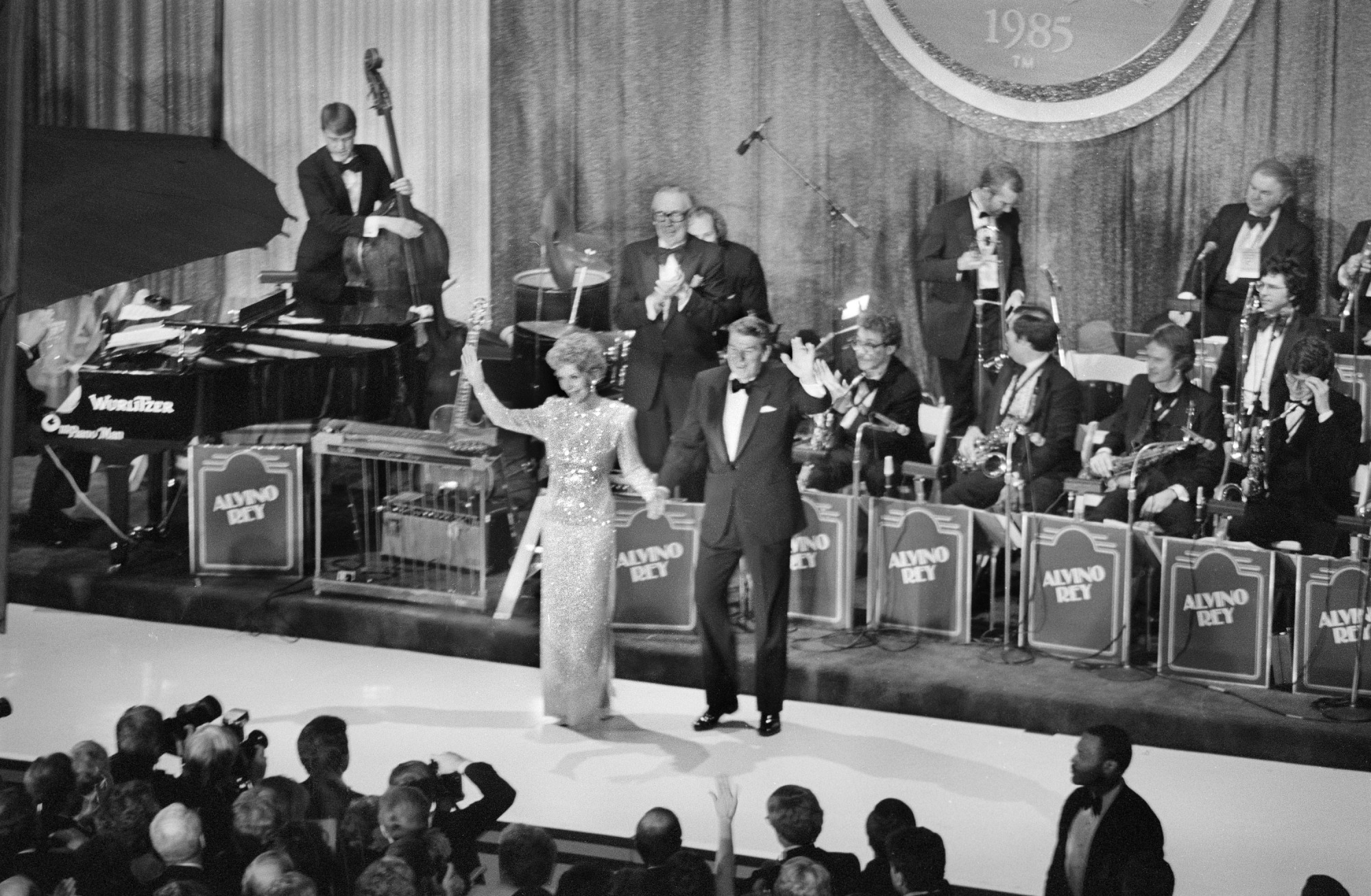 1985 Inaugural Ball: President Ronald Reagan and Mrs. Nancy Reagan in National Air and Space Museum, January 21, 1985