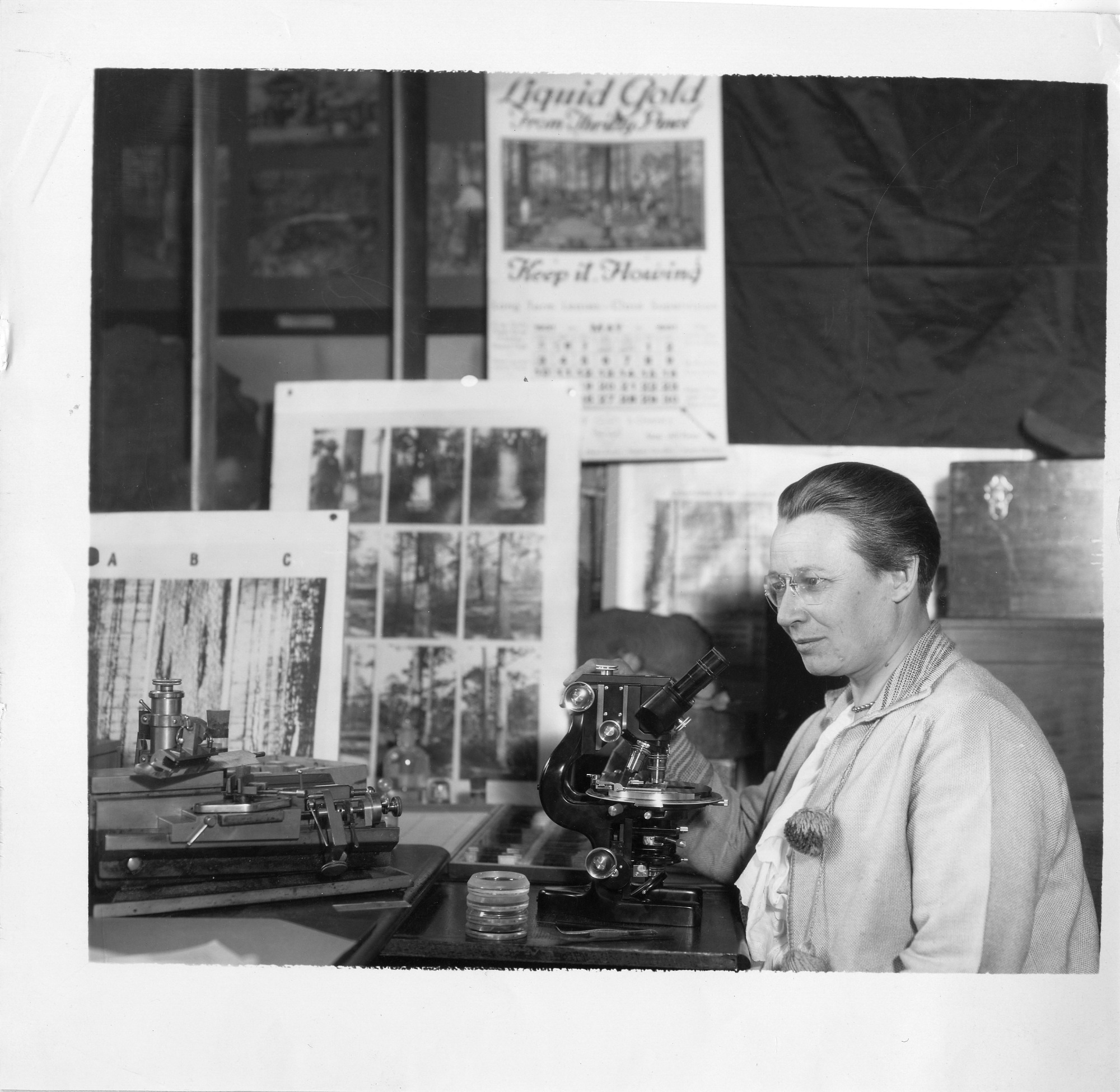 By the 1920s, Eloise Gerry (1885-1970) was considered one of the foremost investigators in wood technology in America and one of few female scientists specializing in research on lumbering, wood utilization, and the turpentining process. After earning a Ph.D. from University of Wisconsin, she spent her career at the U.S. Forest Service's Forest Products Research Laboratory in Madison. The photo caption reads: "Dr. Gerry in her laboratory with the microscope that helped give the great naval stores industry in the United States a new lease on life."