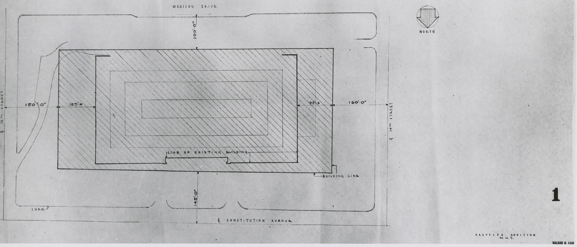 Line drawing of new proposed building footprint superimposed over old building footprint and measurements of walls, by Walker O. Cain.
