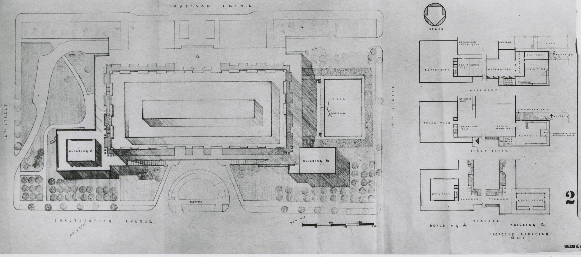 Bird's-eye view line drawing of building and floor plan for proposed addition to the Museum of History and Technology, by Walker O. Cain.