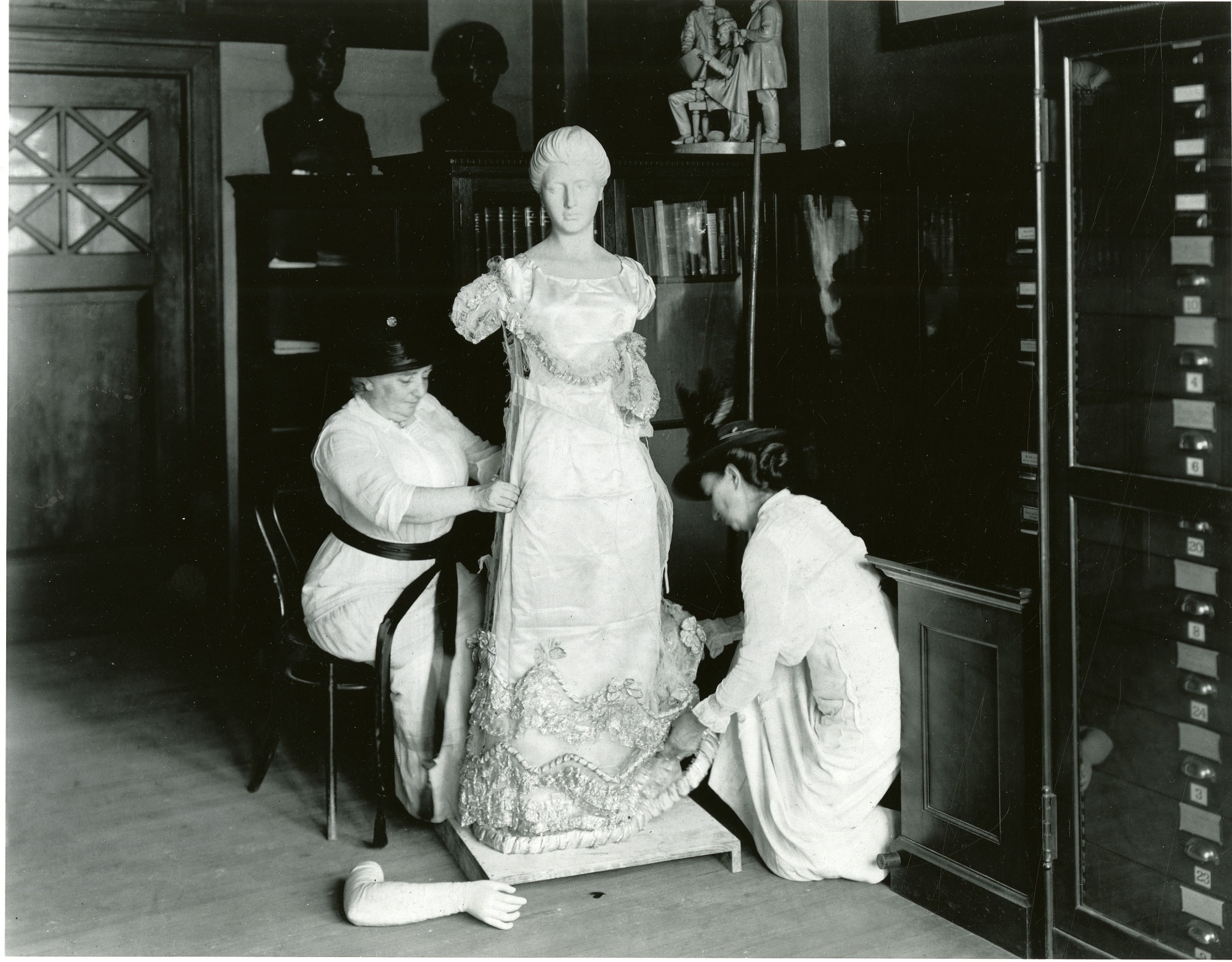 (Left to right) Mrs. Julian James (Chairman and Originator), and Mrs. Rose Gouverneur Hoes (Secretary). The two Washington Socialites who conceived the idea of the First Ladies Hall are shown dressing the figure of Mrs. John Quincy (Louisa Catherine) Adams. The First Ladies Hall was in the Arts and Industries Building from 1912 until it moved to the Museum of History and Technology. From 1912 to 1955 the gowns were displayed in cases. After 1955 they were displayed in room settings.