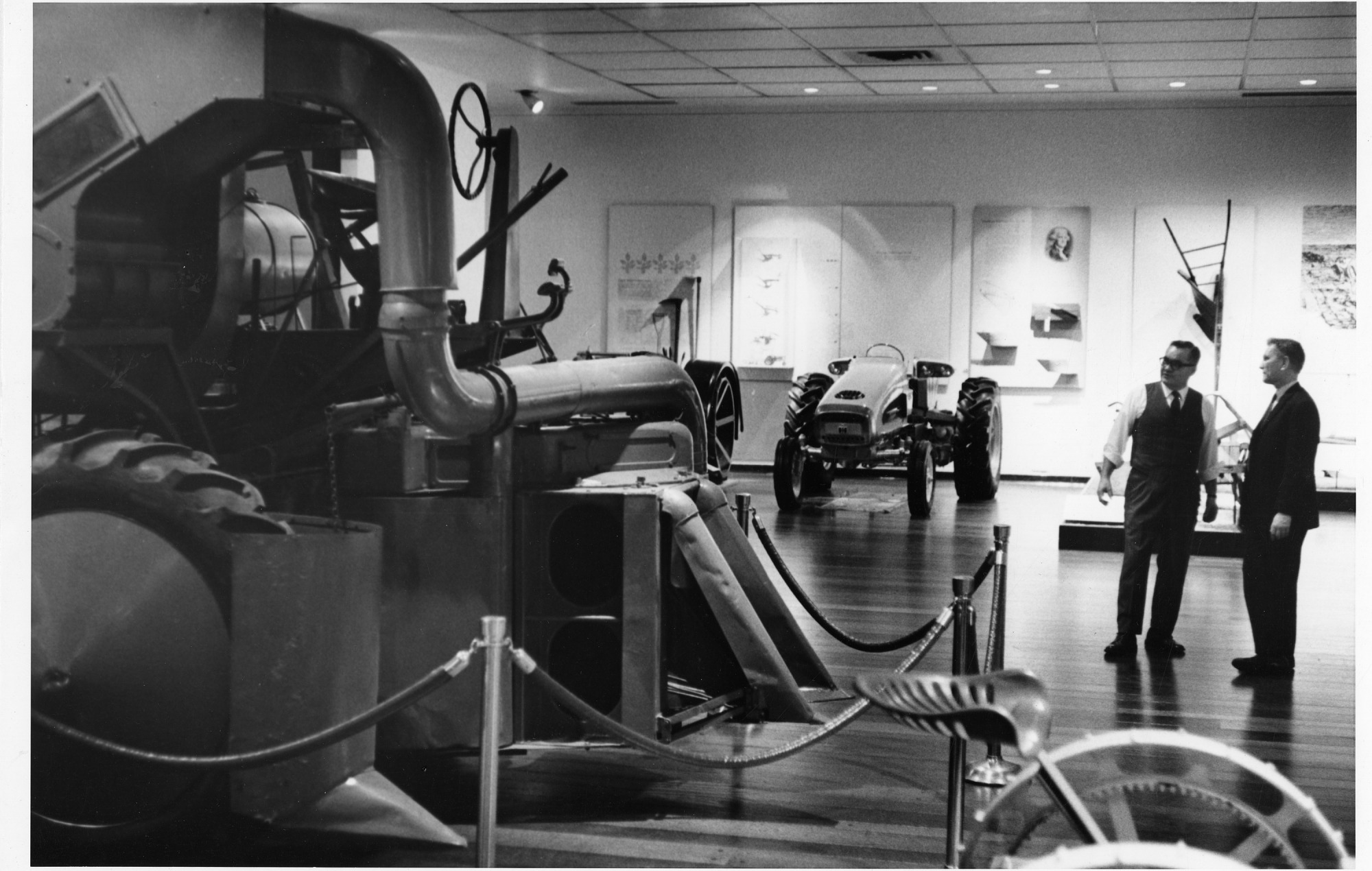 This picture includes a cotton picker to the left, an International Harvester Company (IHC) turbine tractor in the background, John J. Dierbeck of IHC, and an unidentified Agriculture and Mining curator.