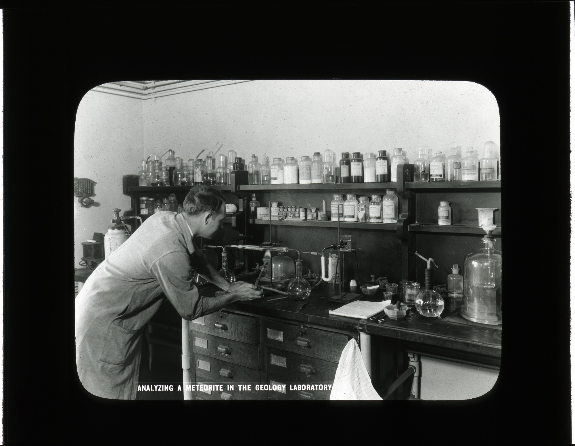 In a corner of the mineralogical laboratory in the Department of Geology, Edward Porter Henderson, 1898-1992, Geologist, Curator of Meteorites, United States National Museum (USNM), conducts an experiment on a meteorite.