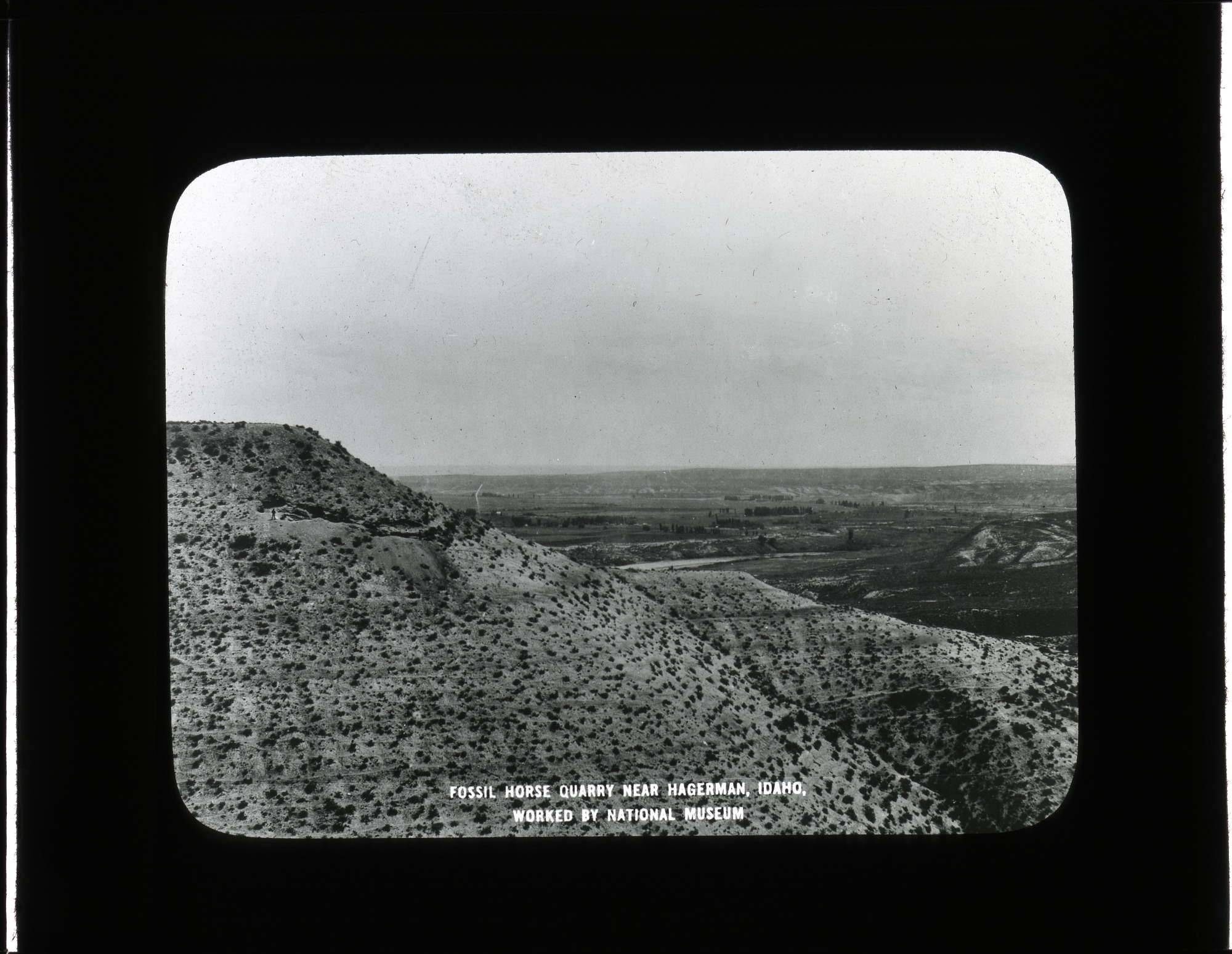Smithsonian's fossil horse quarry near Hagerman, Idaho, as it appeared in 1930 from a vantage point across a small canyon. (The quarry is on the upper slope of the hill in the foreground of the image.) The Smithsonian excavated in the area between 1929 and 1934, and eventually recovered more than 130 skulls, numerous associated jaws, and enough bones for 10 complete skeletons of the Pliocene fossil horse Plesippus shoshonensis (now known as Equus simplicidens).