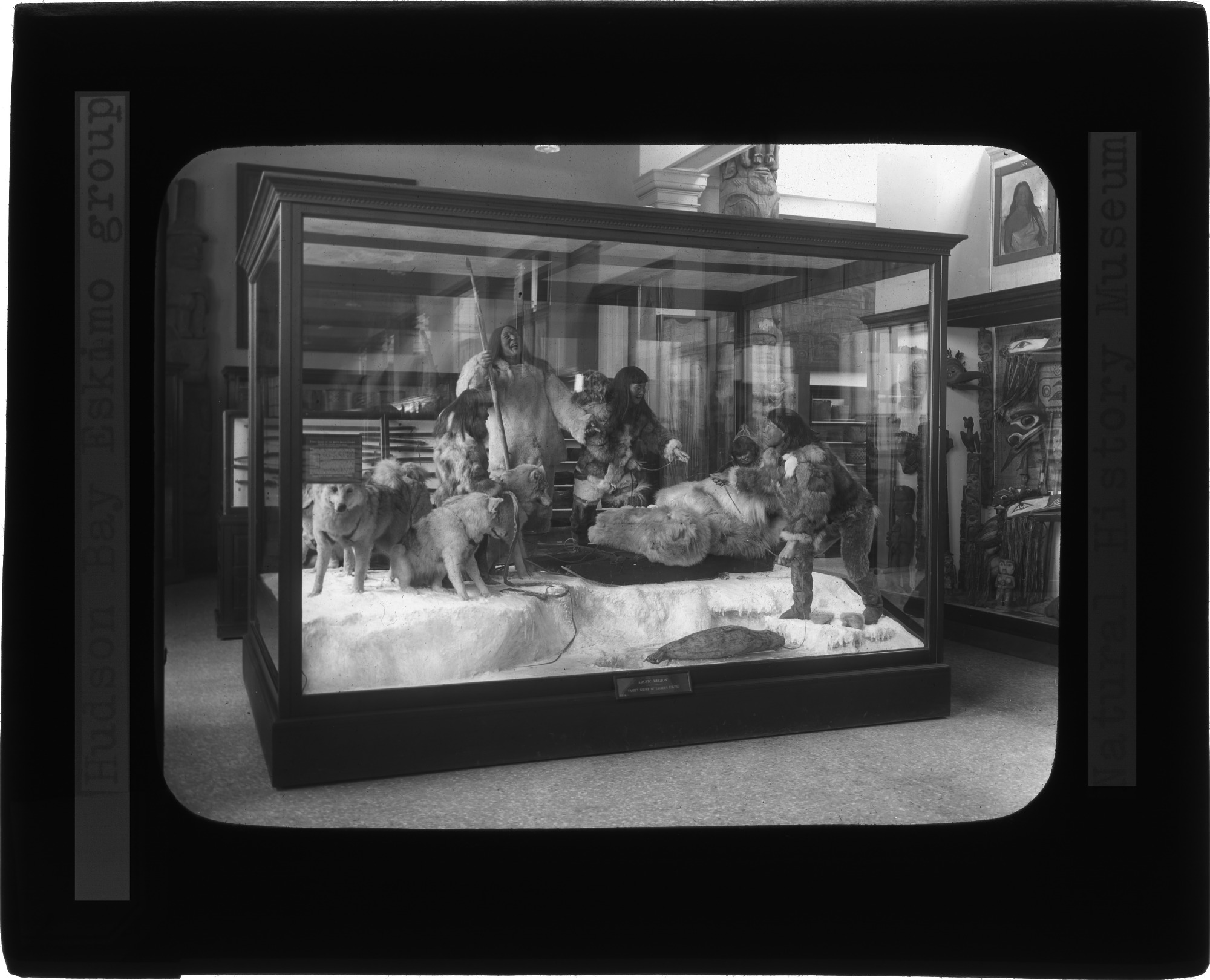 Anthropology exhibit on display at the Natural History Museum, now known as the National Museum of Natural History. The exhibit depicts a Hudson Bay Eskimo group. Exhibit plaque reads: "Arctic Region Family Group of Eastern Eskimo."