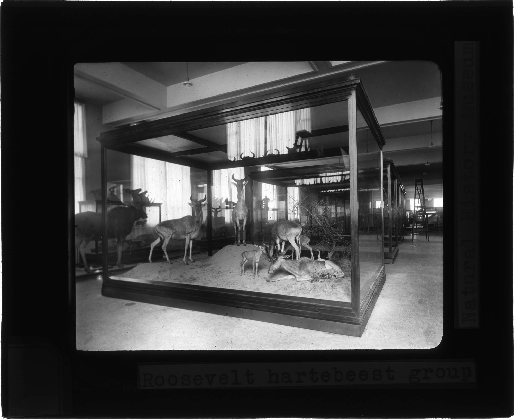 Mammal exhibit on display at the Natural History Museum, now known as the National Museum of Natural History. The exhibit contains a hartebeest group and includes specimens picked up during the Smithsonian-Roosevelt African Expedition in 1909.