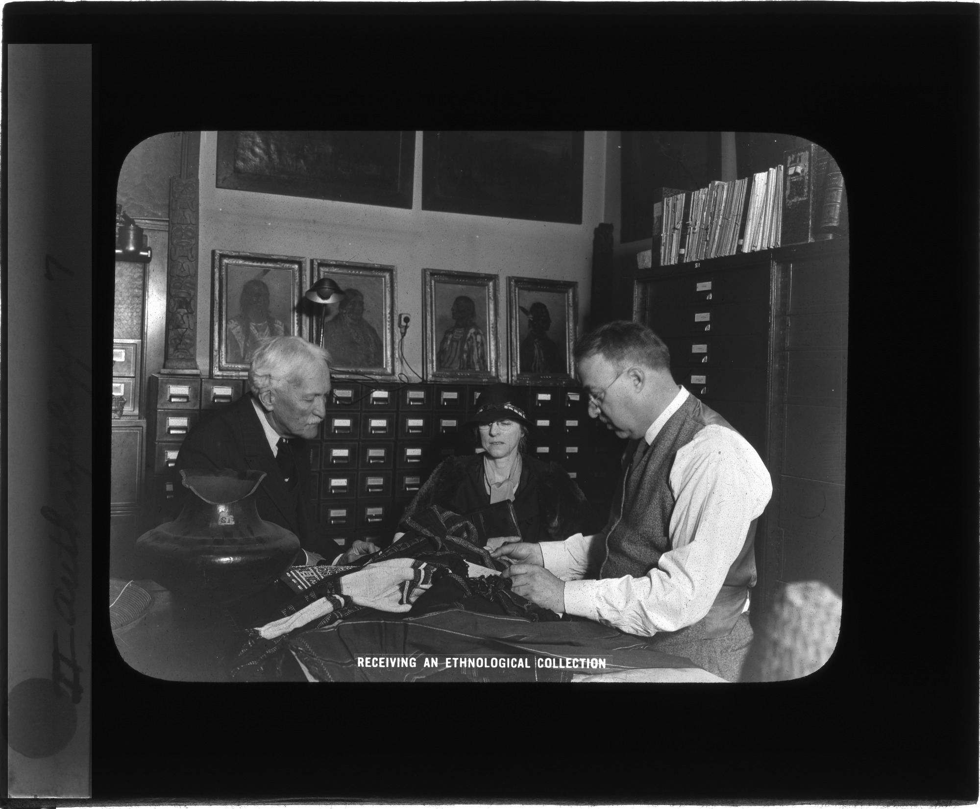 Walter Hough, head curator of the Department of Anthropology at the United States National Museum, now known as the National Museum of Natural History, and staff examine textiles from a new ethnological collection.
