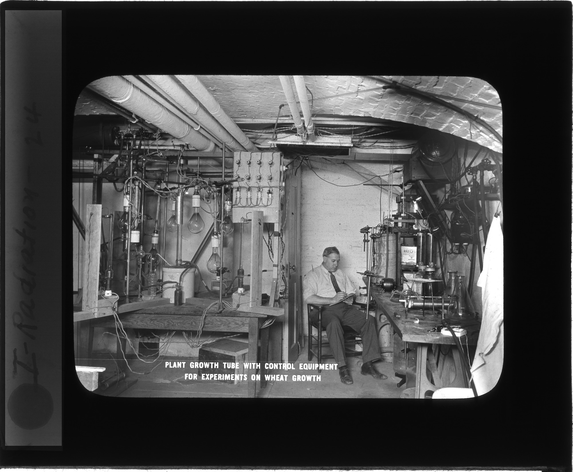 Laboratory of the Division of Radiation and Organisms, located in the basement of the Smithsonian Institution Building, or Castle. Shown here is a plant growth tube with control equipment for experiments on wheat growth.