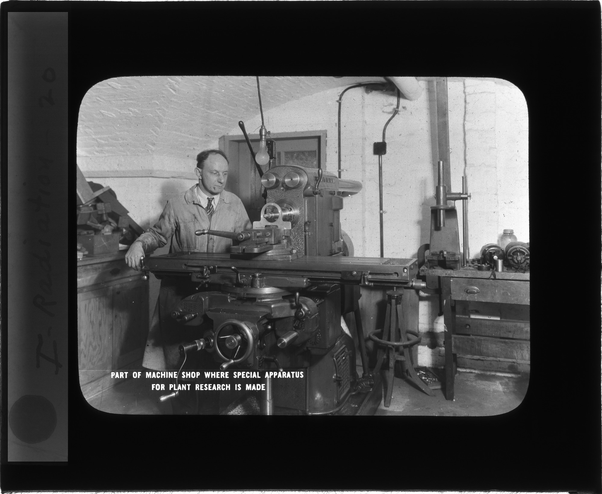 Machine shop where special apparatus for plant research is made for the Division of Radiation and Organisms, located in the basement of the Smithsonian Institution Building, or Castle.