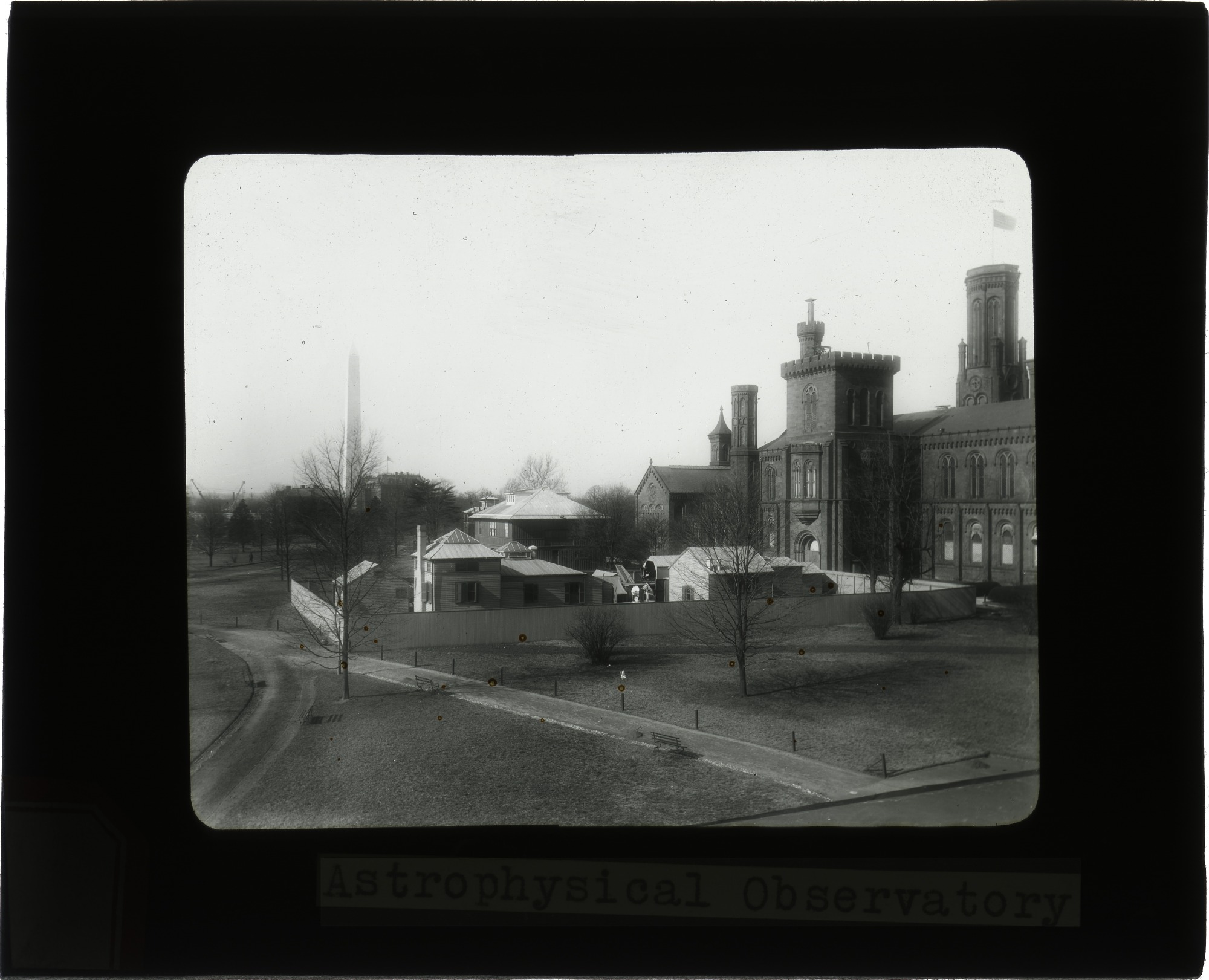 The Smithsonian Astrophysical Observatory located in the South Yard behind the south facade of the Smithsonian Institution Building. The Astrophysical Observatory is enclosed by a wooden fence. The Annex, also called the South Shed, is behind the Observatory. The Laboratory of Natural History, the old Agriculture Building, and the Washington Monument are visible in the background.