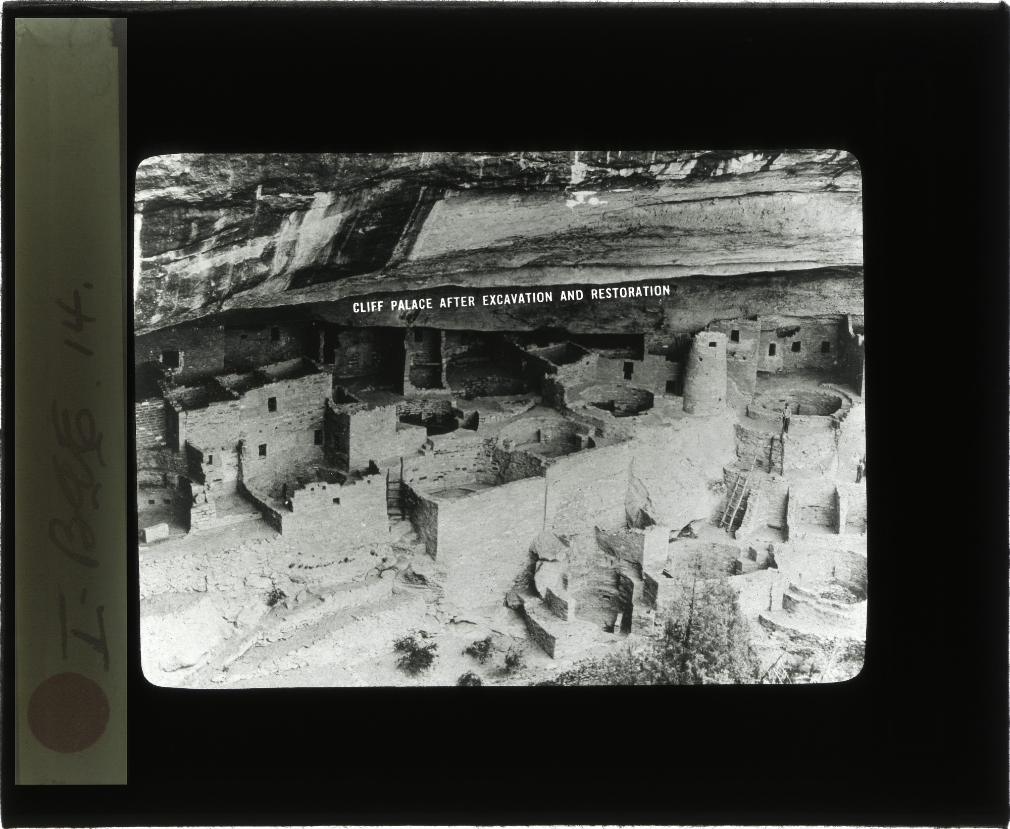 Cliff Palace in Mesa Verde, Colorado after excavation and repair by the Bureau of Ethnology.