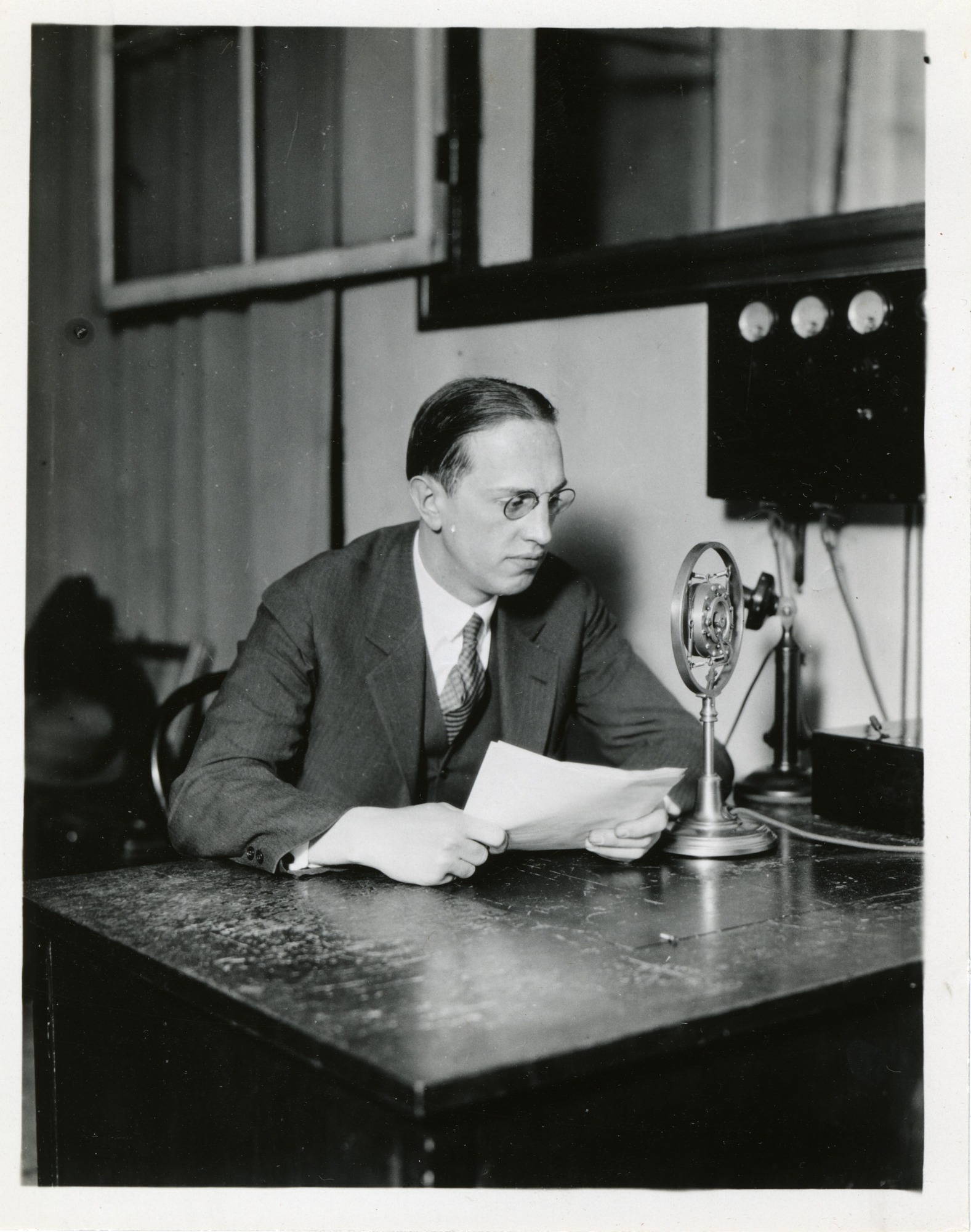 James Stokley (1900-1989), Science Service writer, sitting at desk and speaking into microphone.